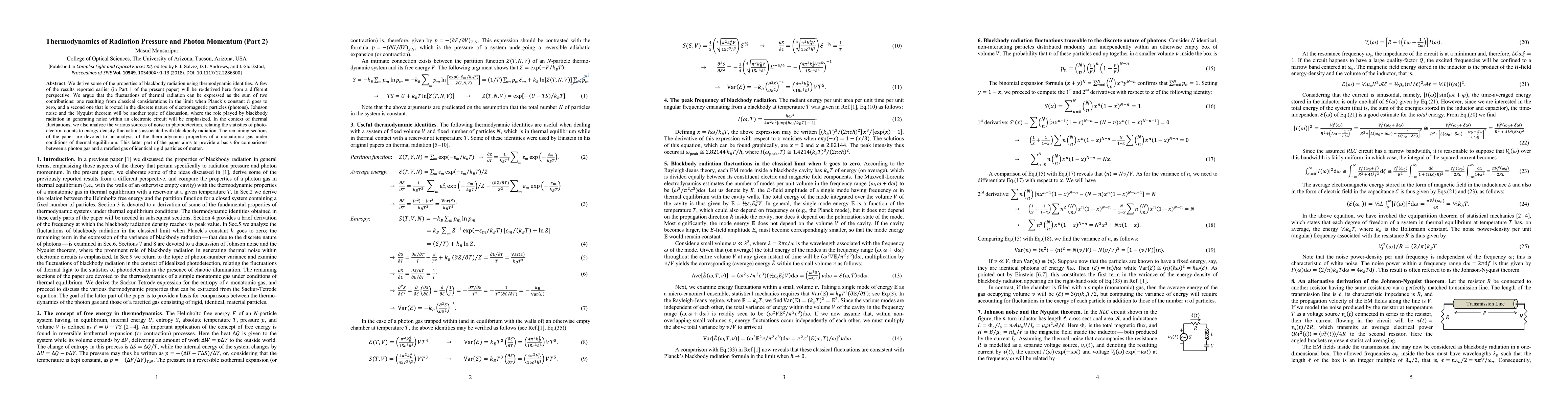 This paper derives thermodynamic properties of blackbody radiation, emphasizing its thermal fluctuations and the role of photon momentum. It discusses Johnson noise and photodetection noise, linking them to blackbody radiation, and compares the thermodynamic properties of a photon gas to those of a monatomic gas in thermal equilibrium.