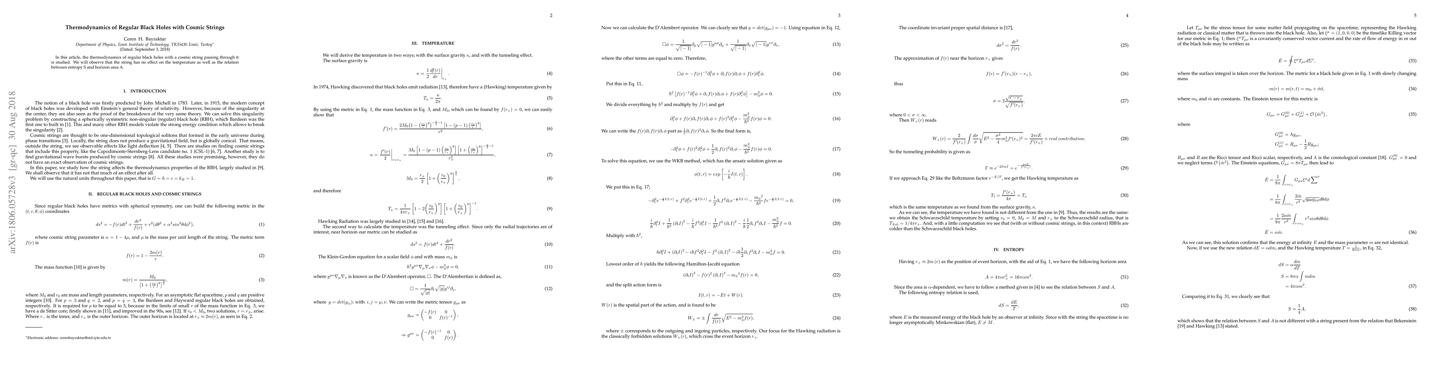 Researchers studied regular black holes with cosmic strings, finding no effect on temperature or entropy-entropy relation; results confirm string's presence has minimal impact on black hole behavior.