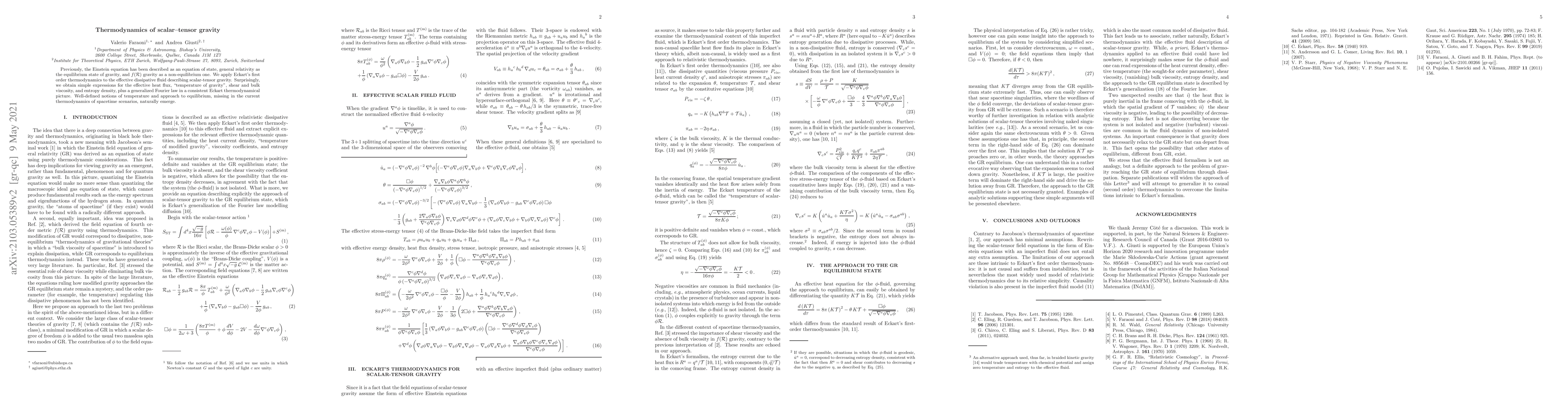 Previously, the Einstein equation has been described as an equation of state, general relativity as the equilibrium state of gravity, and $f({\cal R})$ gravity as a non-equilibrium one. We apply Eckart's first order thermodynamics to the effective dissipative fluid describing scalar-tensor gravity. Surprisingly, we obtain simple expressions for the effective heat flux, "temperature of gravity", shear and bulk viscosity, and entropy density, plus a generalized Fourier law in a consistent Eckart thermodynamical picture. Well-defined notions of temperature and approach to equilibrium, missing in the current thermodynamics of spacetime scenarios, naturally emerge.