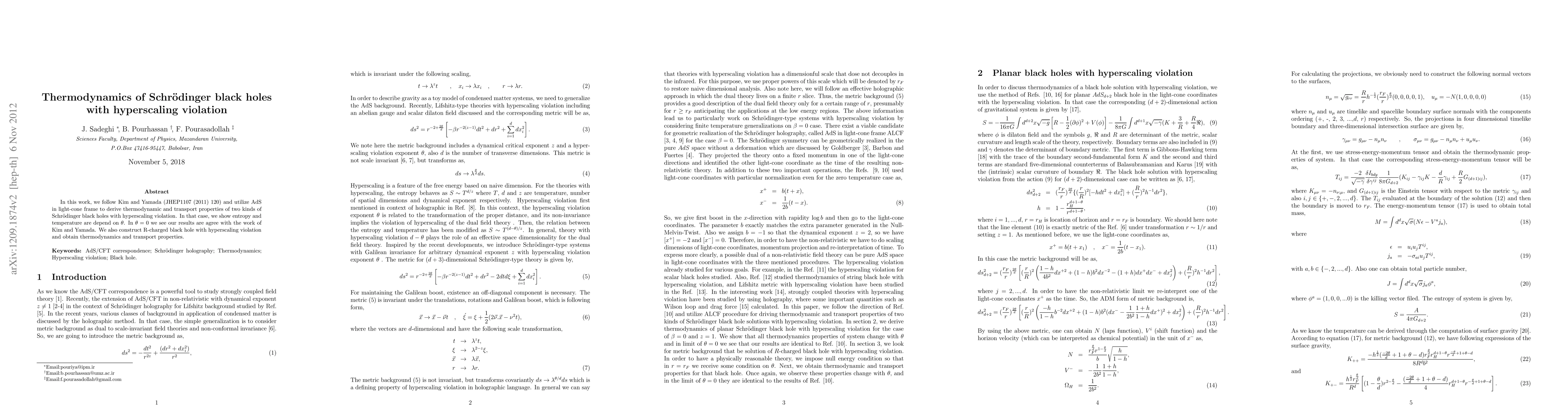 This paper derives thermodynamic and transport properties of Schrödinger black holes with hyperscaling violation in an AdS-Schrödinger background using a light-cone frame. The study confirms that entropy and temperature depend on the parameter $\theta$, and results match previous findings when $\theta=0$. Additionally, it constructs an R-charged black hole with hyperscaling violation and explores its thermodynamic and transport properties.