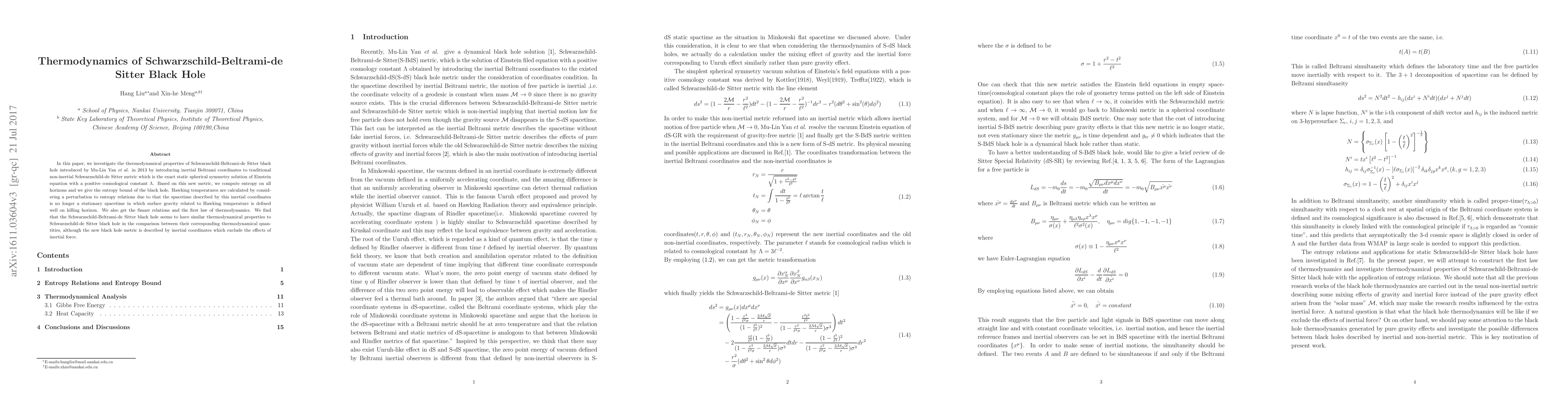 This research investigates the thermodynamics of the Schwarzschild-Beltrami-de Sitter black hole, derived from inertial Beltrami coordinates applied to the Schwarzschild-de Sitter metric. The study computes entropy, Hawking temperature, Smarr relations, and the first law of thermodynamics, finding similar thermodynamic properties compared to the Schwarzschild-de Sitter black hole despite inertial effects.