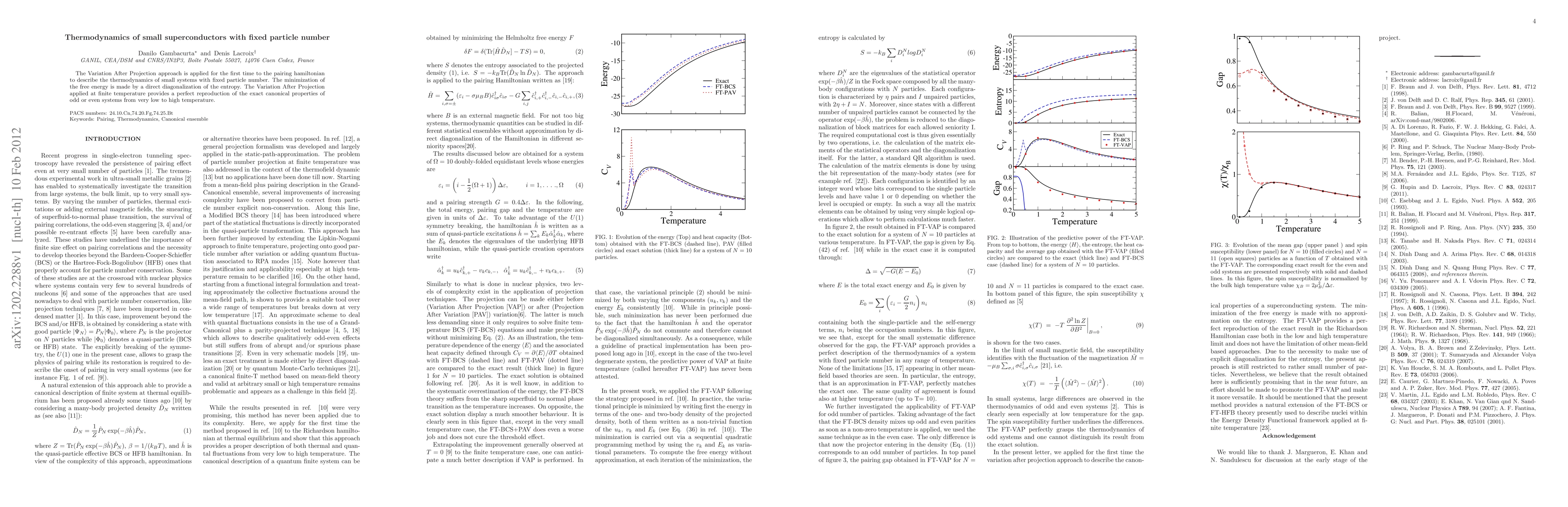 The Variation After Projection (VAP) approach is applied to the pairing Hamiltonian to describe the thermodynamics of small systems with fixed particle number, minimizing the free energy via direct diagonalization of the entropy.