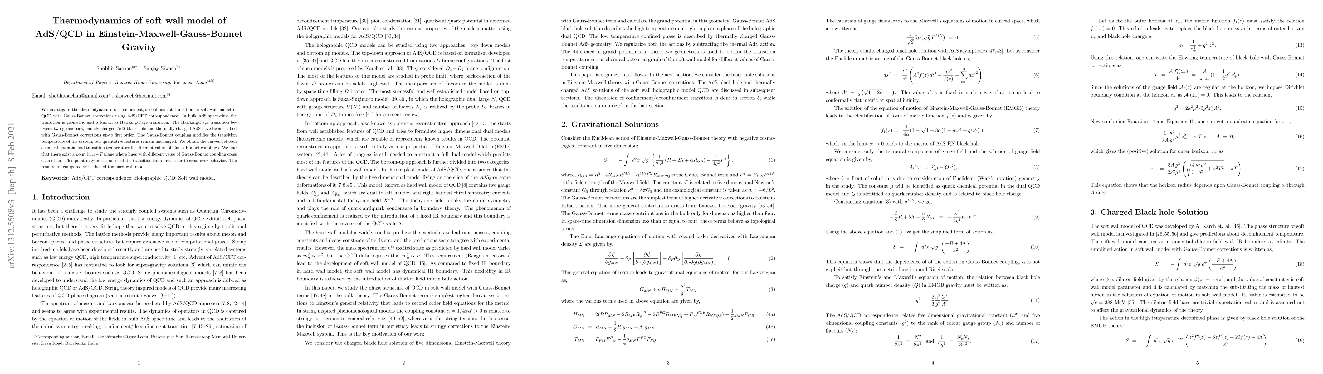 This paper explores the thermodynamics of the confinement/deconfinement transition in the soft wall model of QCD with Gauss-Bonnet corrections, revealing that the Hawking-Page transition in bulk AdS space is modified by the Gauss-Bonnet coupling, potentially indicating a transition from first-order to crossover behavior at a specific point in the $\mu-T$ plane.