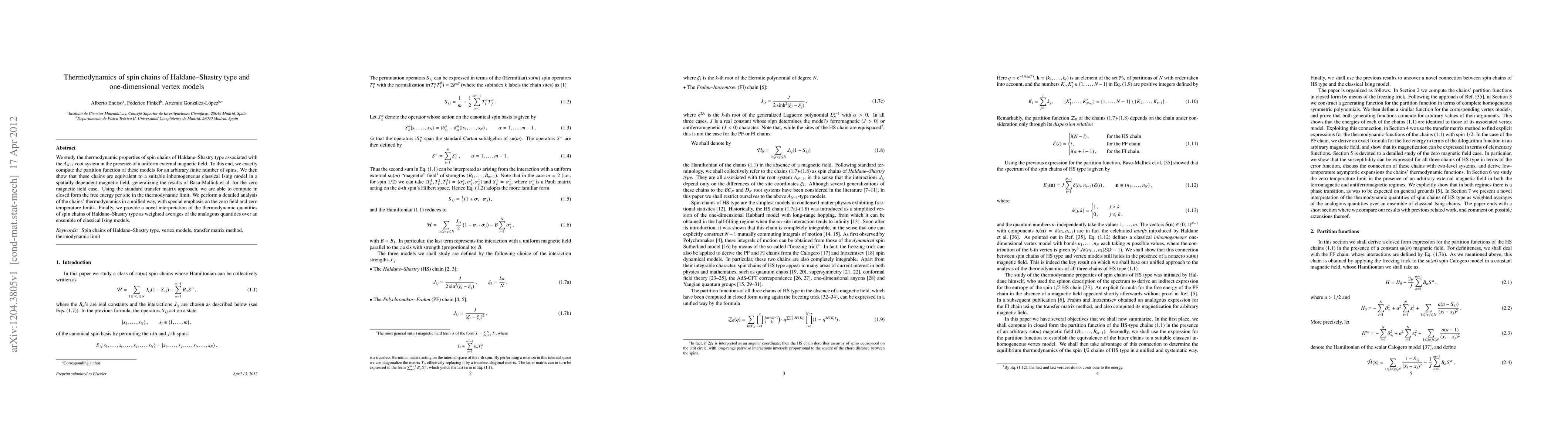 This paper studies the thermodynamic properties of Haldane-Shastry spin chains under a uniform magnetic field, showing their equivalence to inhomogeneous classical Ising models. The authors compute the partition function and free energy per site, providing a novel interpretation of these quantities as weighted averages over classical Ising models.
