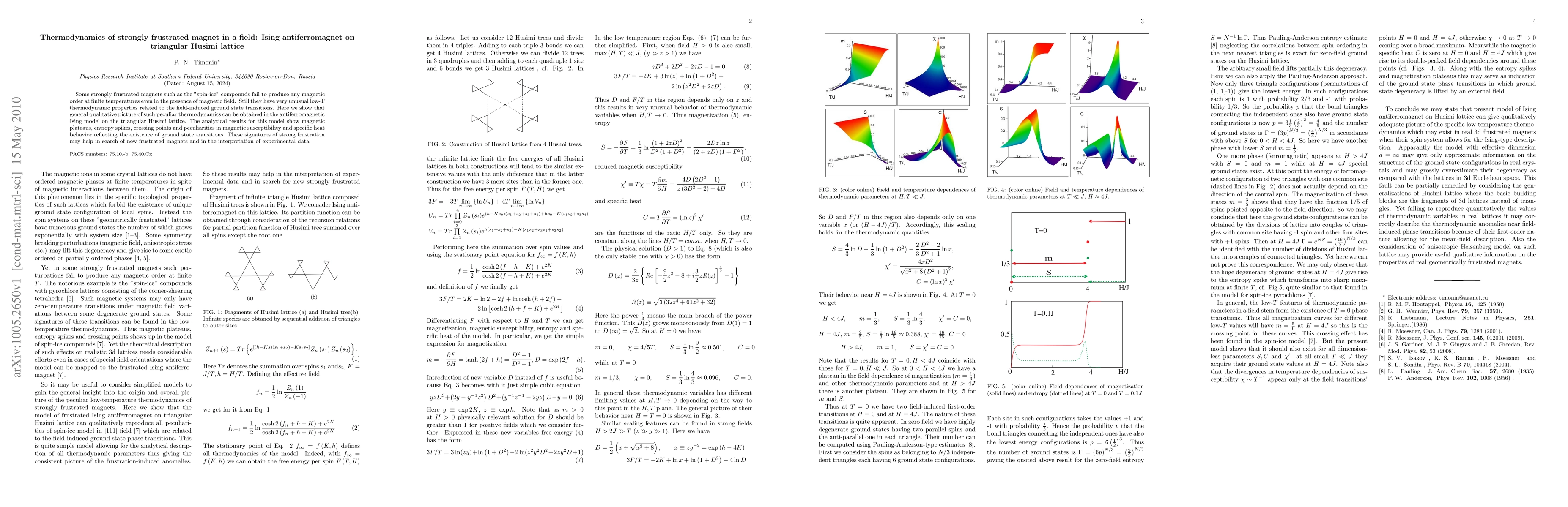 Some strongly frustrated magnets such as the "spin-ice" compounds fail to produce any magnetic order at finite temperatures even in the presence of magnetic field. Still they have very unusual low-temperature thermodynamic properties related to the field-induced ground state transitions. Here we show that general qualitative picture of such peculiar thermodynamics can be obtained in the antiferromagnetic Ising model on the triangular Husimi lattice. The analytical results for this model show magnetic plateaus, entropy spikes, crossing points and peculiarities in magnetic susceptibility and specific heat behavior reflecting the existence of ground state transitions. These signatures of strong frustration may help in search of new frustrated magnets and in the interpretation of experimental data.