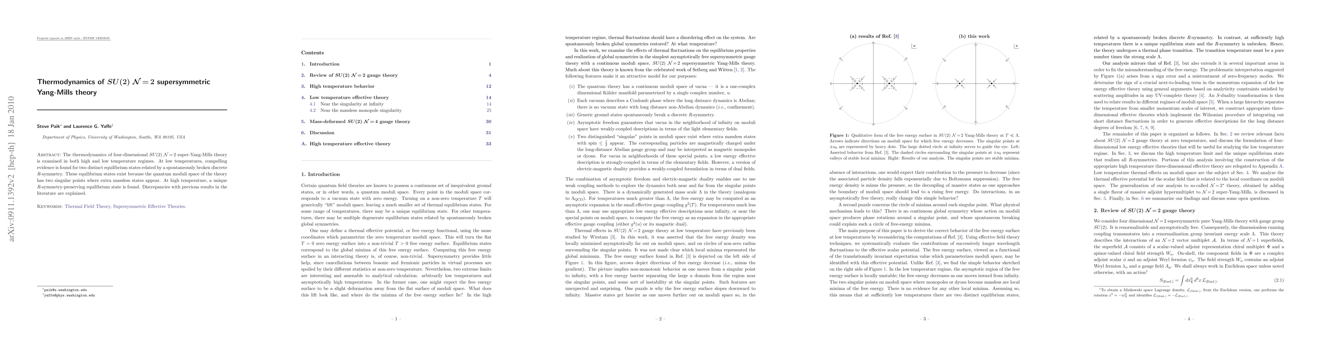 This paper investigates the thermodynamics of four-dimensional SU(2) N=2 supersymmetric Yang-Mills theory, revealing two distinct equilibrium states at low temperatures due to spontaneously broken discrete R-symmetry, and a single R-symmetry-preserving state at high temperatures, resolving previous discrepancies.