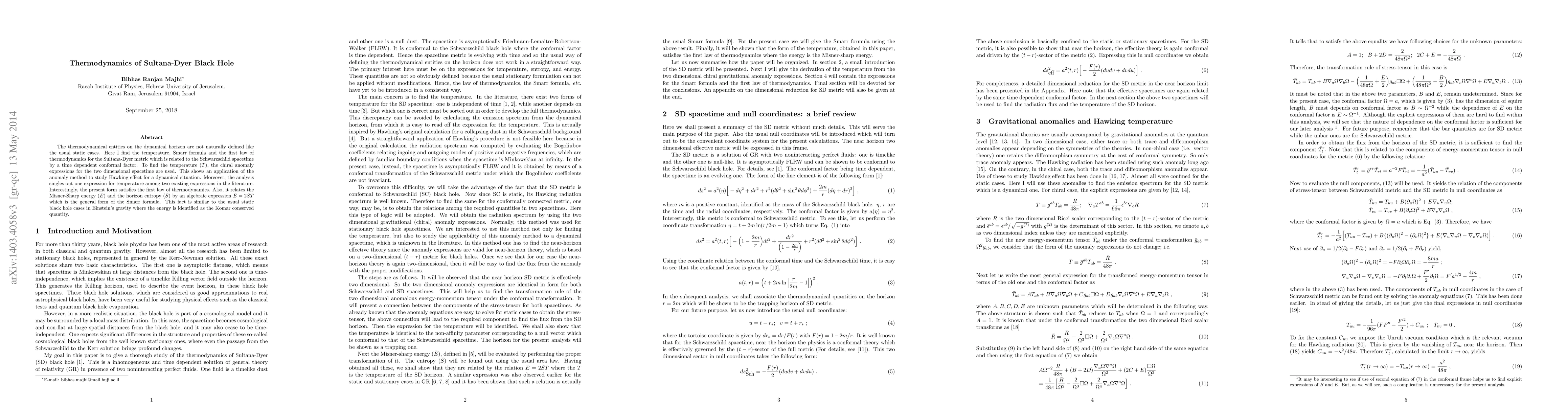 The thermodynamical entities on the dynamical horizon are not naturally defined like the usual static cases. Here I find the temperature, Smarr formula and the first law of thermodynamics for the Sultana-Dyer metric which is related to the Schwarzschild spacetime by a time dependent conformal factor. To find the temperature ($T$), the chiral anomaly expressions for the two dimensional spacetime are used. This shows an application of the anomaly method to study Hawking effect for a dynamical situation. Moreover, the analysis singles out one expression for temperature among two existing expressions in the literature. Interestingly, the present form satisfies the first law of thermodynamics. Also, it relates the Misner-Sharp energy ($\bar{E}$) and the horizon entropy ($\bar{S}$) by an algebraic expression $\bar{E}=2\bar{S}T$ which is the general form of the Smarr formula. This fact is similar to the usual static black hole cases in Einstein's gravity where the energy is identified as the Komar conserved quantity.
