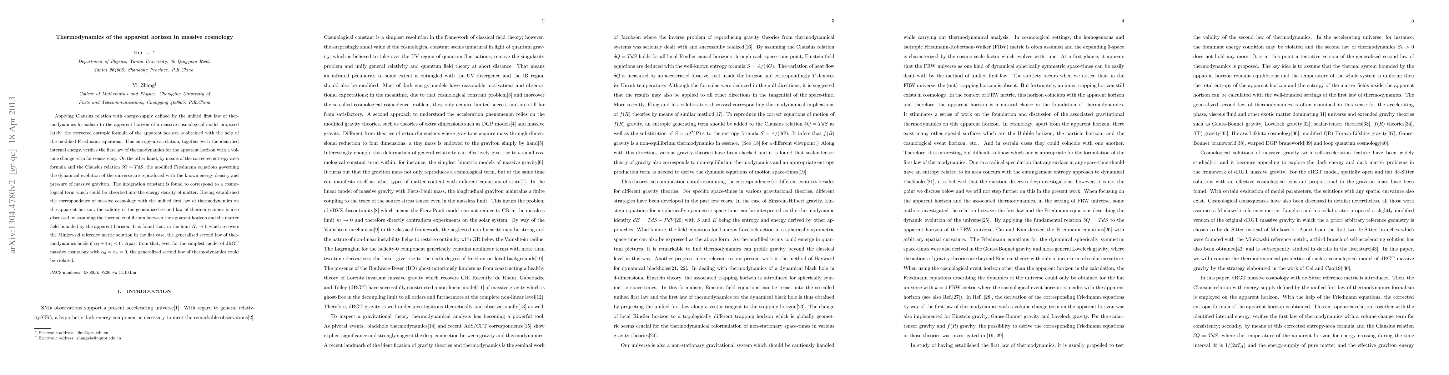 This paper applies the unified first law of thermodynamics to the apparent horizon in a massive cosmological model, deriving a corrected entropy-area relation. It shows the consistency of the first law with a volume change term and reproduces modified Friedmann equations, revealing a cosmological term absorbed into matter energy density. The study also discusses the validity of the generalized second law of thermodynamics under thermal equilibrium assumptions, finding that it holds under certain conditions but can be violated in simpler models.