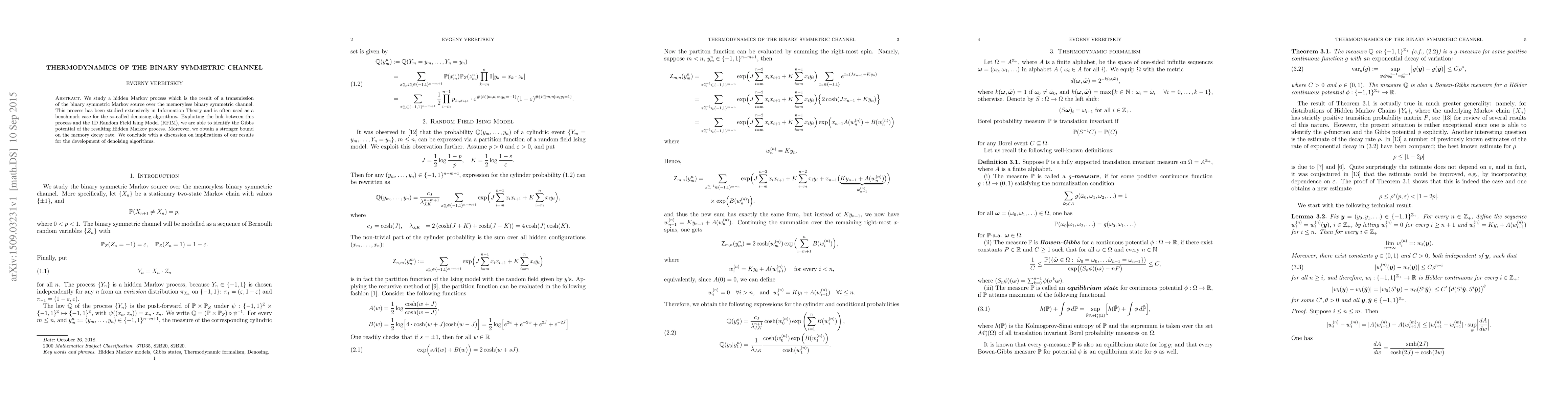 We study a hidden Markov process which is the result of a transmission of the binary symmetric Markov source over the memoryless binary symmetric channel. This process has been studied extensively in Information Theory and is often used as a benchmark case for the so-called denoising algorithms. Exploiting the link between this process and the 1D Random Field Ising Model (RFIM), we are able to identify the Gibbs potential of the resulting Hidden Markov process. Moreover, we obtain a stronger bound on the memory decay rate. We conclude with a discussion on implications of our results for the development of denoising algorithms.