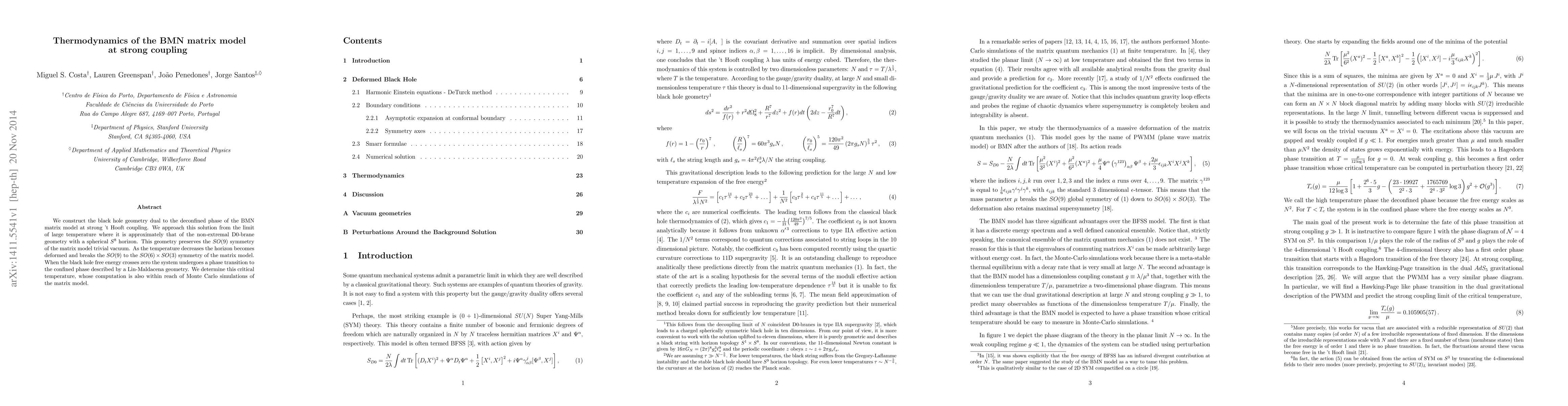 This paper constructs a black hole geometry dual to the BMN matrix model at strong coupling, showing how it transitions from an $SO(9)$ symmetric to an $SO(6)\times SO(3)$ symmetric configuration as temperature decreases, culminating in a phase transition to a confined phase described by Lin-Maldacena geometry. The critical temperature for this transition is identified and potentially computable via Monte Carlo simulations.