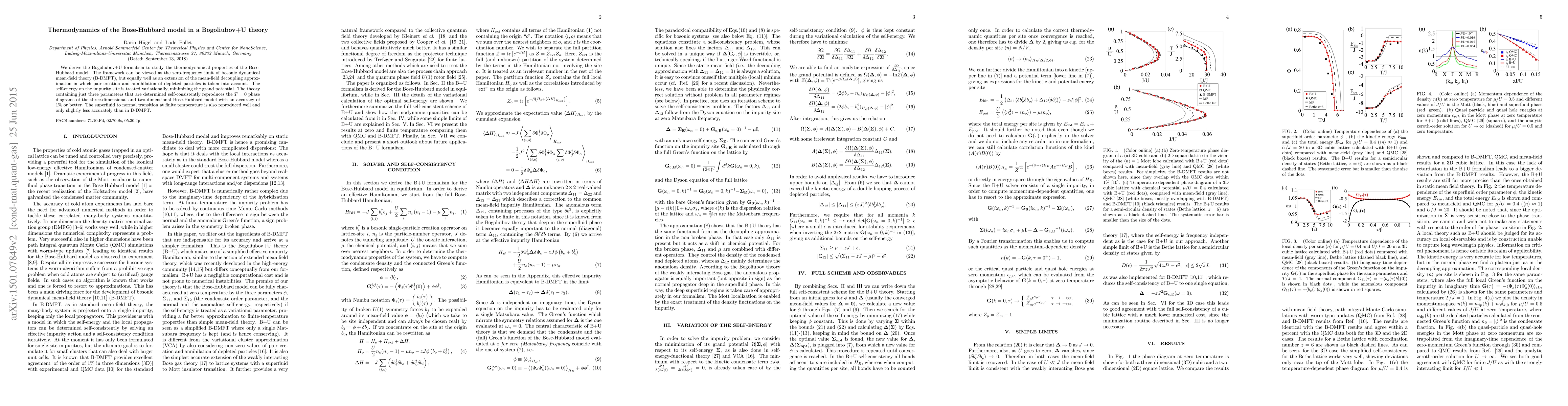 This paper develops the Bogoliubov+U formalism to analyze the thermodynamic properties of the Bose-Hubbard model, achieving high accuracy in reproducing phase diagrams and the superfluid-normal transition, with a minimal set of three self-consistently determined parameters. The approach extends mean-field theory by incorporating pair creation and annihilation processes.