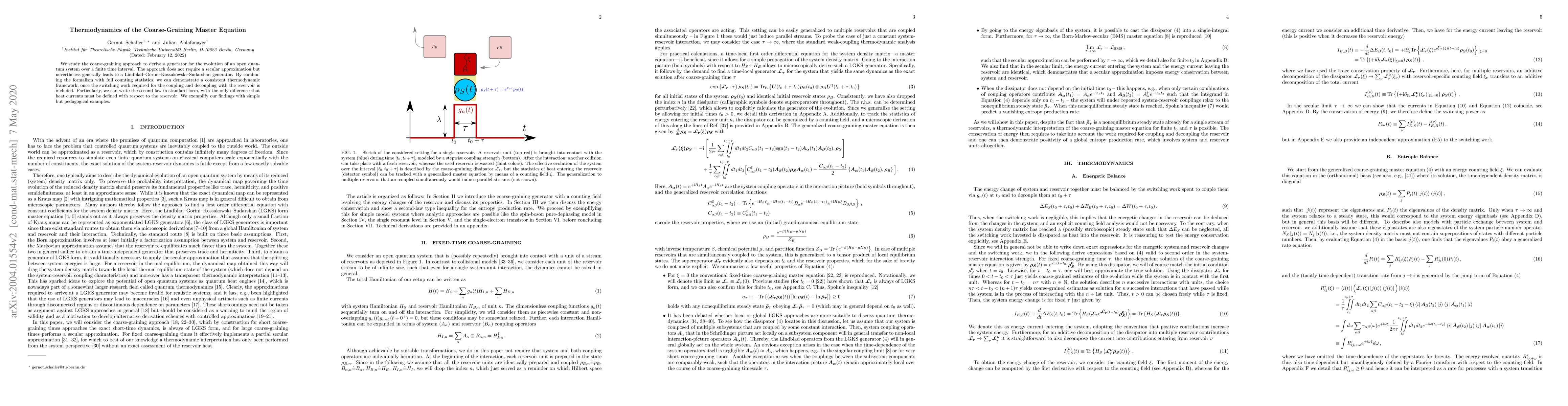 We study the coarse-graining approach to derive a generator for the evolution of an open quantum system over a finite time interval. The approach does not require a secular approximation but nevertheless generally leads to a Lindblad-Gorini-Kossakowski-Sudarshan generator. By combining the formalism with Full Counting Statistics, we can demonstrate a consistent thermodynamic framework, once the switching work required for the coupling and decoupling with the reservoir is included. Particularly, we can write the second law in standard form, with the only difference that heat currents must be defined with respect to the reservoir. We exemplify our findings with simple but pedagogical examples.