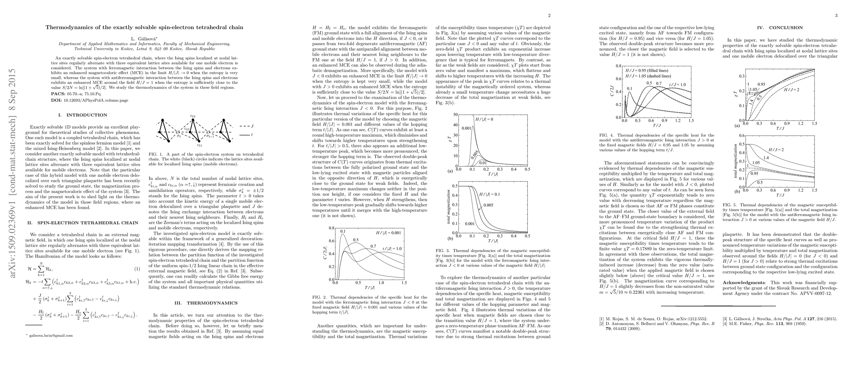 An exactly solvable spin-electron tetrahedral chain, where the Ising spins localized at nodal lattice sites regularly alternate with three equivalent lattice sites available for one mobile electron is considered. The system with ferromagnetic interaction between the Ising spins and electrons exhibits an enhanced magnetocaloric effect (MCE) in the limit $H/|J|\to 0$ when the entropy is very small, whereas the system with antiferromagnetic interaction between the Ising spins and electrons exhibits an enhanced MCE around the field $H/J=1$ when the entropy is sufficiently close to the value $S/2N = \ln[(1+\sqrt{5})/2]$. We study the thermodynamics of the system in these field regions.
