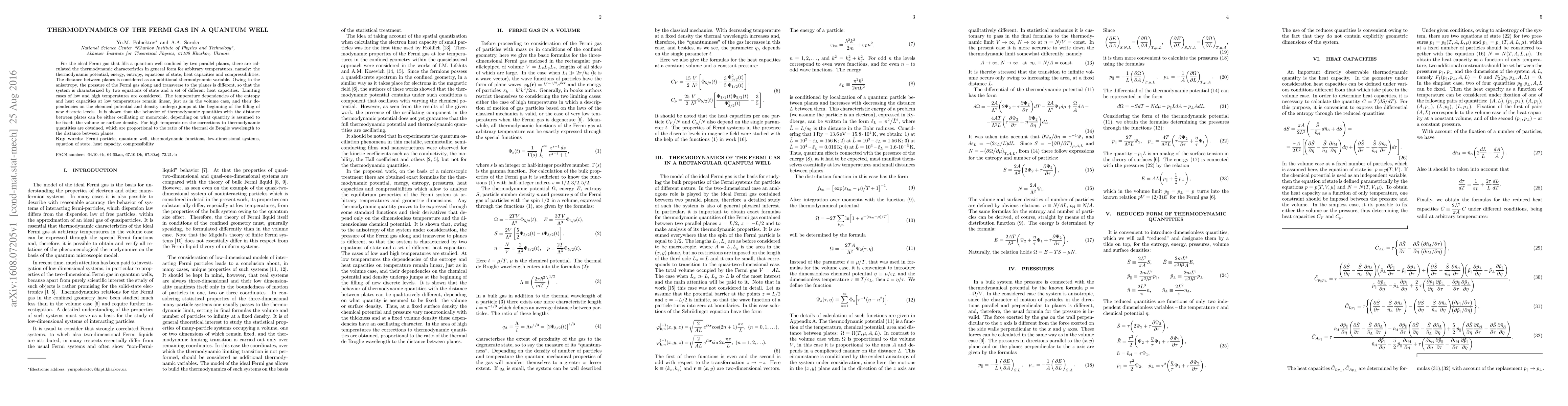 For the ideal Fermi gas that fills a quantum well confined by two parallel planes, there are calculated the thermodynamic characteristics in general form for arbitrary temperatures, namely: the thermodynamic potential, energy, entropy, equations of state, heat capacities and compressibilities. The distance between planes is considered as an additional thermodynamic variable. Owing to the anisotropy, the pressure of the Fermi gas along and transverse to the planes is different, so that the system is characterized by two equations of state and a set of different heat capacities. Limiting cases of low and high temperatures are considered. The temperature dependencies of the entropy and heat capacities at low temperatures remain linear, just as in the volume case, and their dependencies on the chemical potential and density undergo jumps at the beginning of the filling of new discrete levels. It is shown that the behavior of thermodynamic quantities with the distance between plates can be either oscillating or monotonic, depending on what quantity is assumed to be fixed: the volume or surface density. For high temperatures the corrections to thermodynamic quantities are obtained, which are proportional to the ratio of the thermal de Broglie wavelength to the distance between planes.
