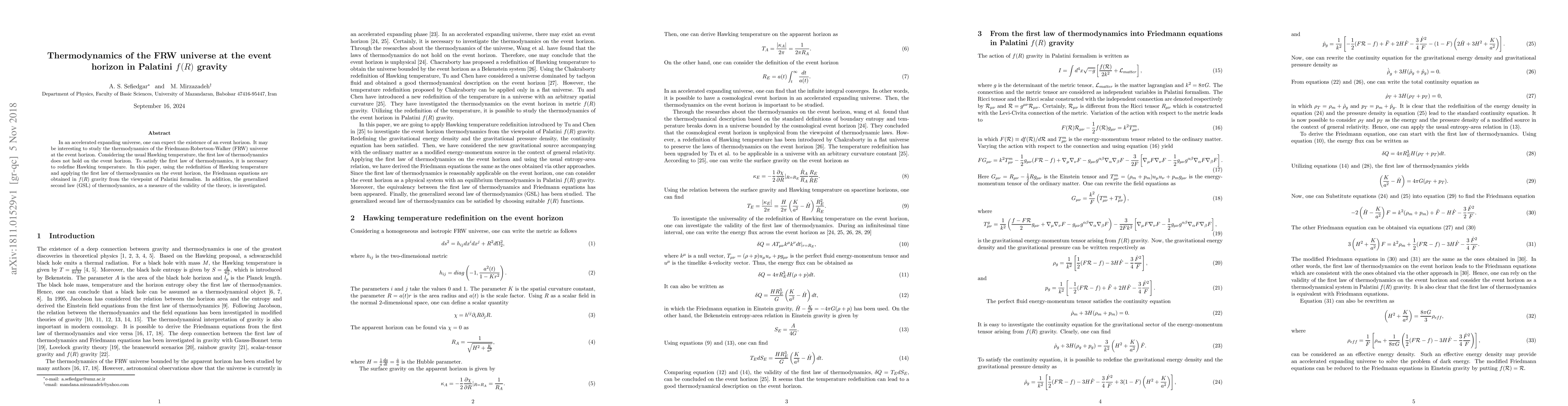 This paper explores the thermodynamics of the FRW universe at its event horizon within the framework of Palatini f(R) gravity, proposing a redefined Hawking temperature to satisfy the first law of thermodynamics and deriving Friedmann equations. It also examines the generalized second law of thermodynamics to validate the theoretical approach.