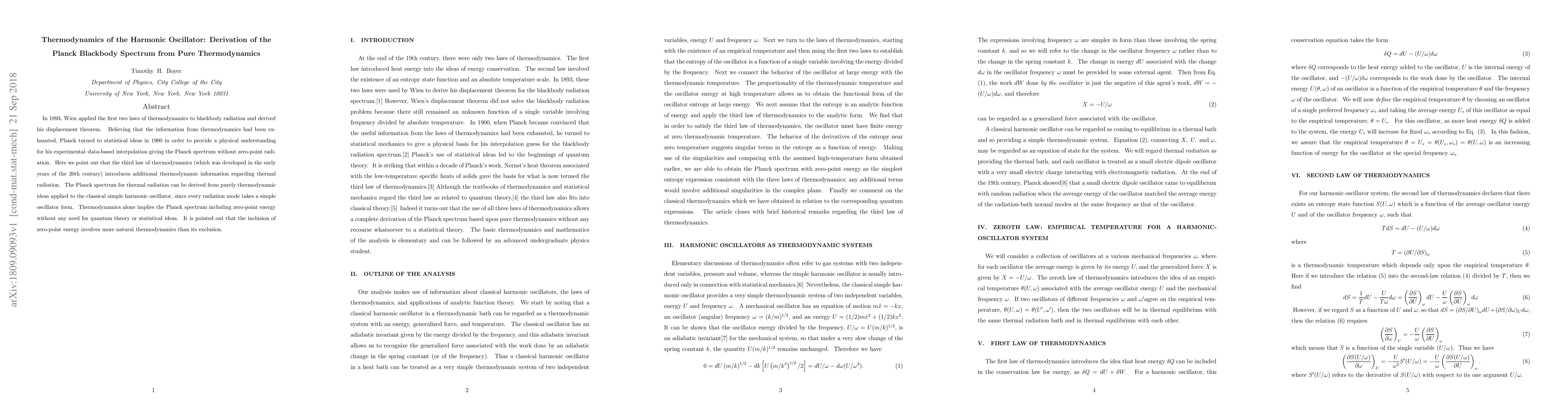 This paper demonstrates that the Planck blackbody spectrum can be derived purely from thermodynamic principles applied to the classical harmonic oscillator model, showing that zero-point energy is a natural consequence of thermodynamic reasoning, thus eliminating the need for quantum theory or statistical mechanics.