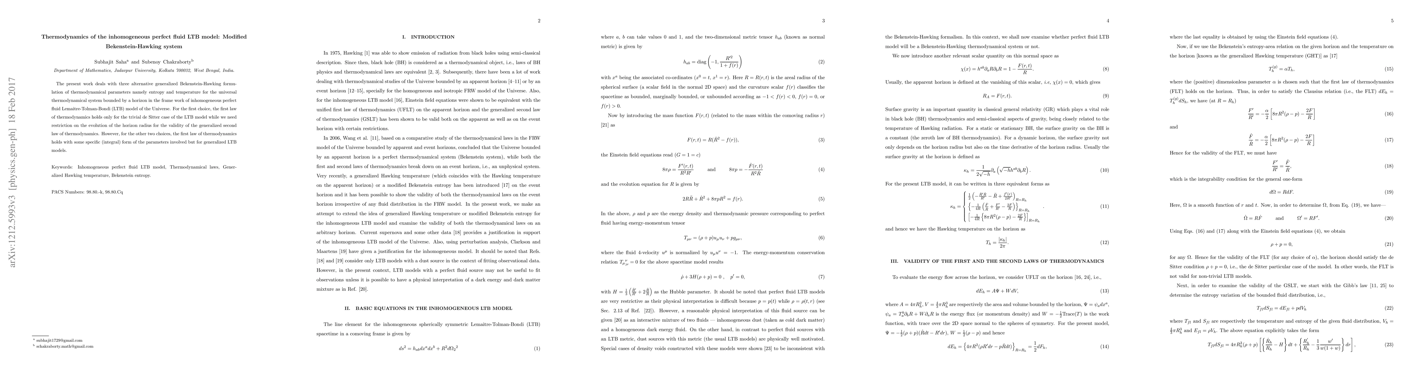 This paper explores three generalized Bekenstein-Hawking formulations for entropy and temperature in the inhomogeneous perfect fluid Lemaitre-Tolman-Bondi (LTB) model of the Universe. While the first choice only satisfies the first law of thermodynamics in the de Sitter case, the other two choices maintain the first law under specific conditions for generalized LTB models.