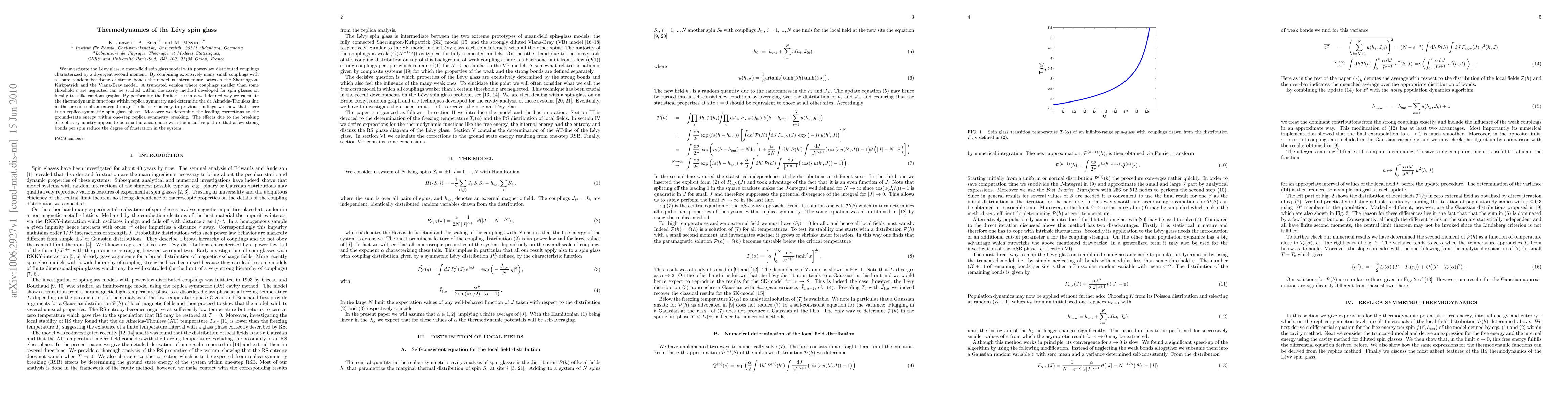 This paper investigates the thermodynamic properties of a mean-field spin glass model with L\'evy distributed couplings, finding no replica-symmetric spin glass phase. It determines the de Almeida-Thouless line and leading corrections to the ground-state energy, showing small effects from replica symmetry breaking due to strong bonds.