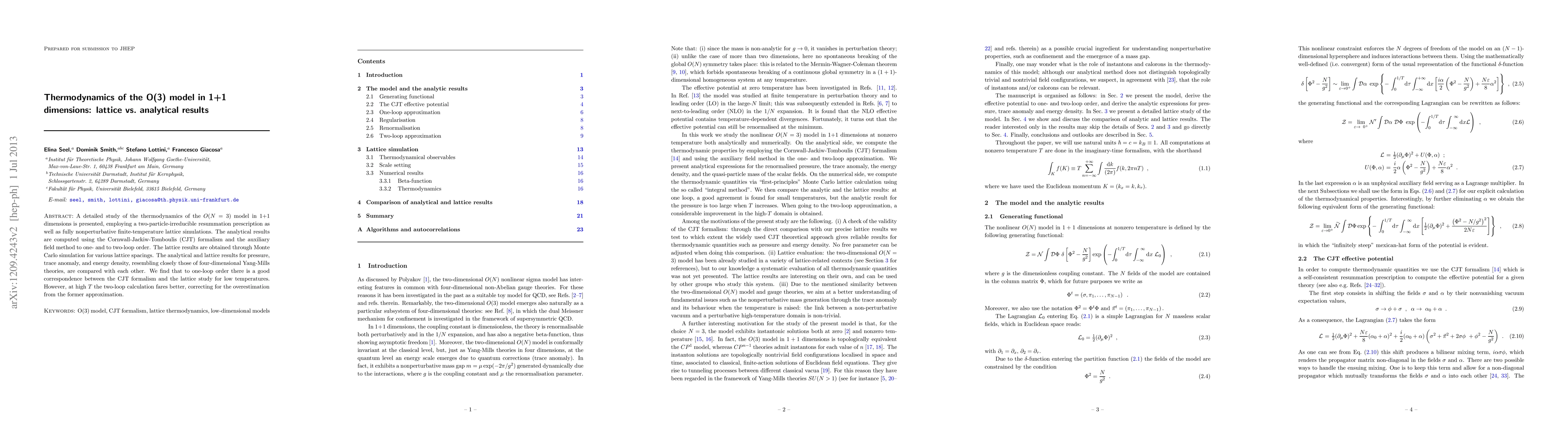 A detailed study of the thermodynamics of the O(N=3) model in 1+1 dimensions is presented, employing a two-particle-irreducible resummation prescription as well as fully nonperturbative finite-temperature lattice simulations. The analytical results are computed using the Cornwall-Jackiw-Tomboulis (CJT) formalism and the auxiliary field method to one- and to two-loop order. The lattice results are obtained through Monte Carlo simulation for various lattice spacings. The analytical and lattice results for pressure, trace anomaly, and energy density, resembling closely those of four-dimensional Yang-Mills theories, are compared with each other. We find that to one-loop order there is a good correspondence between the CJT formalism and the lattice study for low temperatures. However, at high T the two-loop calculation fares better, correcting for the overestimation from the former approximation.