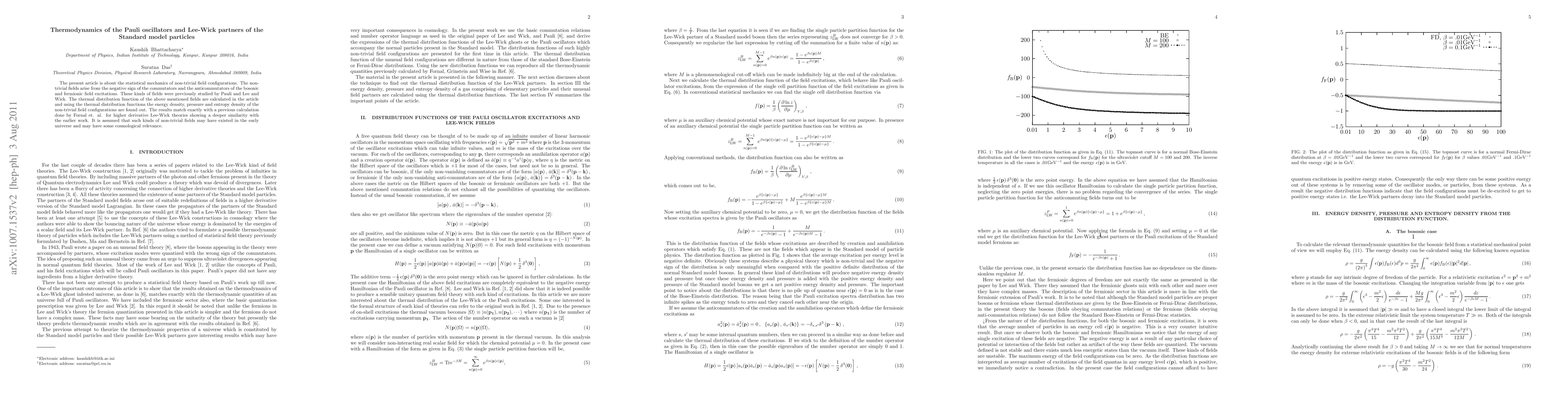Researchers studied thermodynamics of Pauli oscillators and Lee-Wick partners in Standard Model particles, finding similarities with previous calculations and suggesting potential cosmological relevance.
