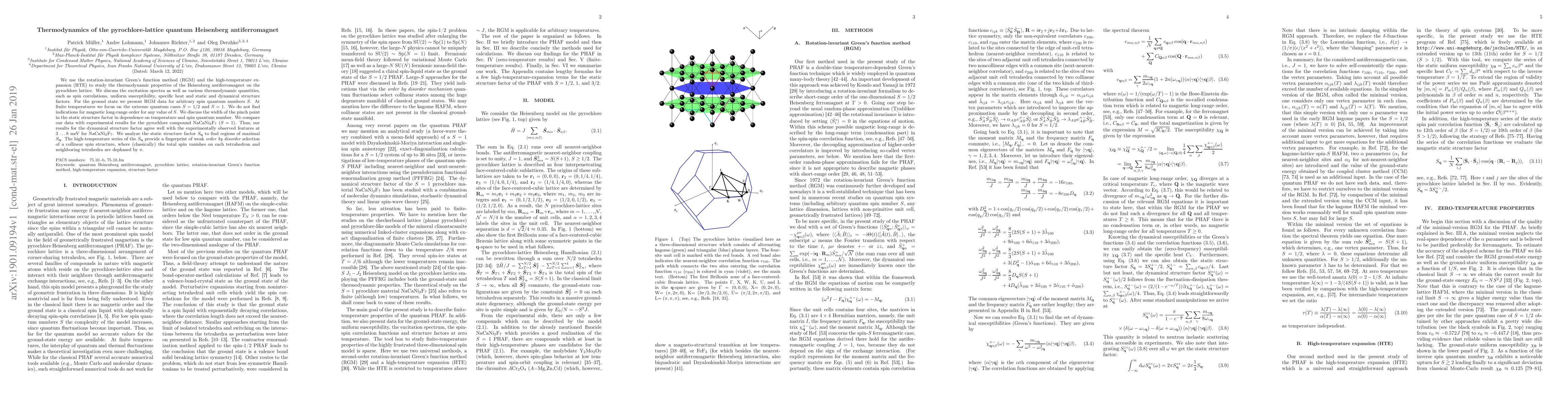 We use the rotation-invariant Green's function method (RGM) and the high-temperature expansion (HTE) to study the thermodynamic properties of the Heisenberg antiferromagnet on the pyrochlore lattice. We discuss the excitation spectra as well as various thermodynamic quantities, such as spin correlations, uniform susceptibility, specific heat and static and dynamical structure factors. For the ground state we present RGM data for arbitrary spin quantum numbers $S$. At finite temperatures we focus on the extreme quantum cases $S=1/2$ and $S=1$. We do not find indications for magnetic long-range order for any value of $S$. We discuss the width of the pinch point in the static structure factor in dependence on temperature and spin quantum number. We compare our data with experimental results for the pyrochlore compound NaCaNi$_2$F$_7$ ($S=1$). Thus, our results for the dynamical structure factor agree well with the experimentally observed features at 3 \ldots 8~meV for NaCaNi$_2$F$_7$. We analyze the static structure factor ${S}_{\bf q}$ to find regions of maximal ${S}_{\bf q}$. The high-temperature series of the ${S}_{\bf q}$ provide a fingerprint of weak {\it order by disorder} selection of a collinear spin structure, where (classically) the total spin vanishes on each tetrahedron and neighboring tetrahedra are dephased by $\pi$.