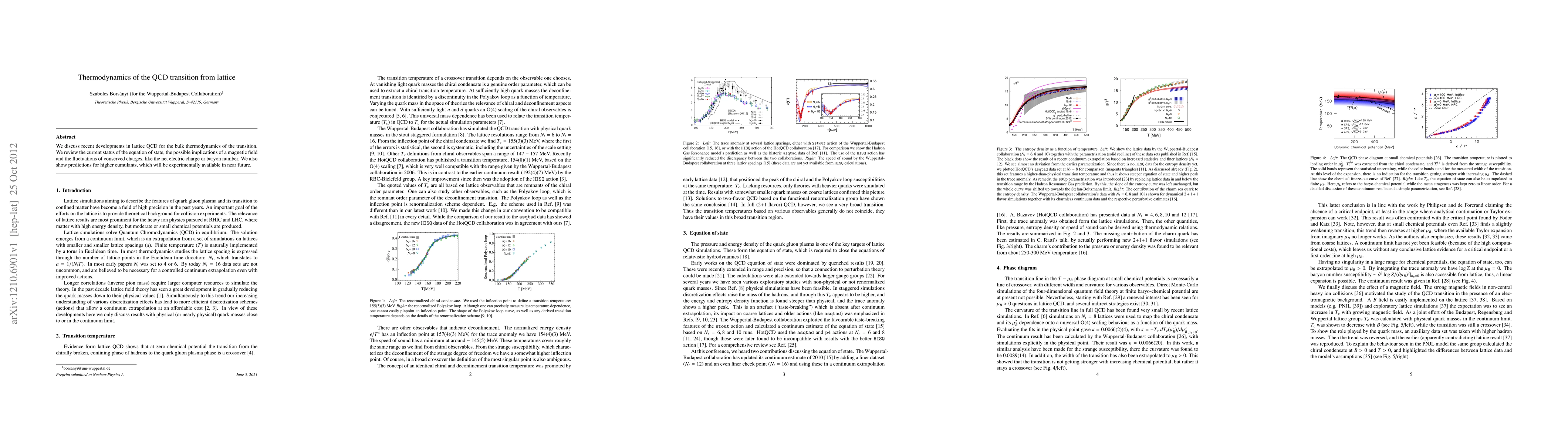 We discuss recent developments in lattice QCD for the bulk thermodynamics of the transition. We review the current status of the equation of state, the possible implications of a magnetic field and the fluctuations of conserved charges, like the net electric charge or baryon number. We also show predictions for higher cumulants, which will be experimentally available in near future.