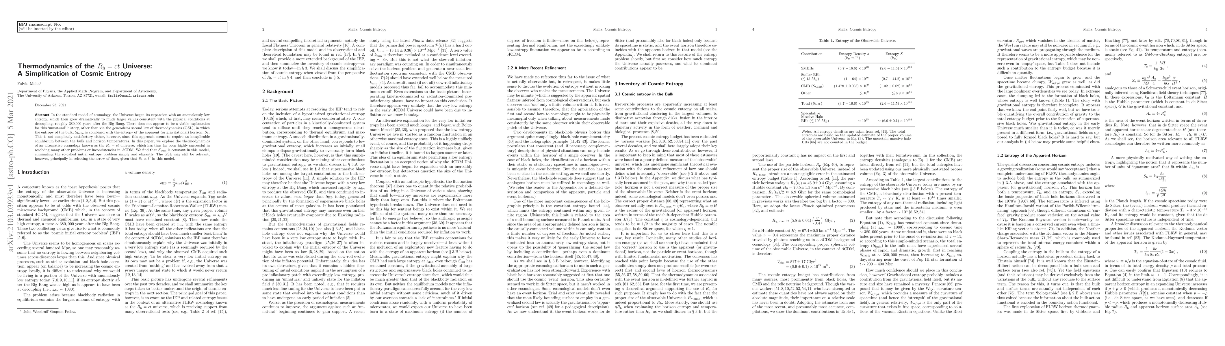 In the standard model of cosmology, the Universe began its expansion with an anomalously low entropy, which then grew dramatically to much larger values consistent with the physical conditions at decoupling, roughly 380,000 years after the Big Bang. There does not appear to be a viable explanation for this `unnatural' history, other than via the generalized second law of thermodynamics (GSL), in which the entropy of the bulk, S_bulk, is combined with the entropy of the apparent (or gravitational) horizon, S_h. This is not completely satisfactory either, however, since this approach seems to require an inexplicable equilibrium between the bulk and horizon temperatures. In this paper, we explore the thermodynamics of an alternative cosmology known as the R_h=ct universe, which has thus far been highly successful in resolving many other problems or inconsistencies in LCDM. We find that S_bulk is constant in this model, eliminating the so-called initial entropy problem simply and elegantly. The GSL may still be relevant, however, principally in selecting the arrow of time, given that S_h ~ t^2 in this model.