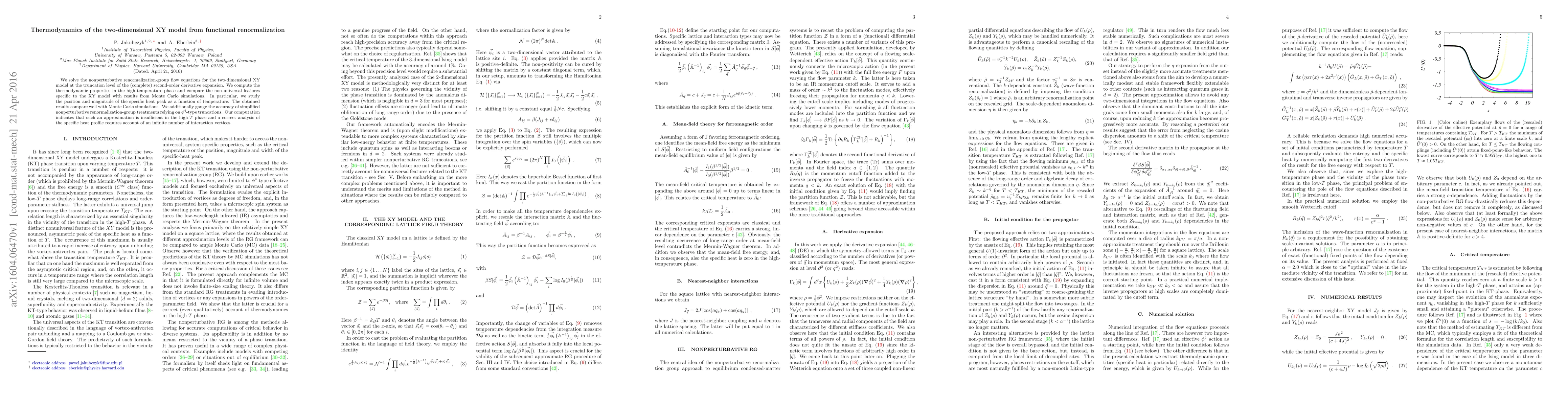 We solve the nonperturbative renormalization-group flow equations for the two-dimensional XY model at the truncation level of the (complete) second-order derivative expansion. We compute the thermodynamic properties in the high-temperature phase and compare the non-universal features specific to the XY model with results from Monte Carlo simulations. In particular, we study the position and magnitude of the specific heat peak as a function of temperature. The obtained results compare well with Monte Carlo simulations. We additionally gauge the accuracy of simplified nonperturbative renormalization-group treatments relying on $\phi^4$-type truncations. Our computation indicates that such an approximation is insufficient in the high-$T$ phase and a correct analysis of the specific heat profile requires account of an infinite number of interaction vertices.