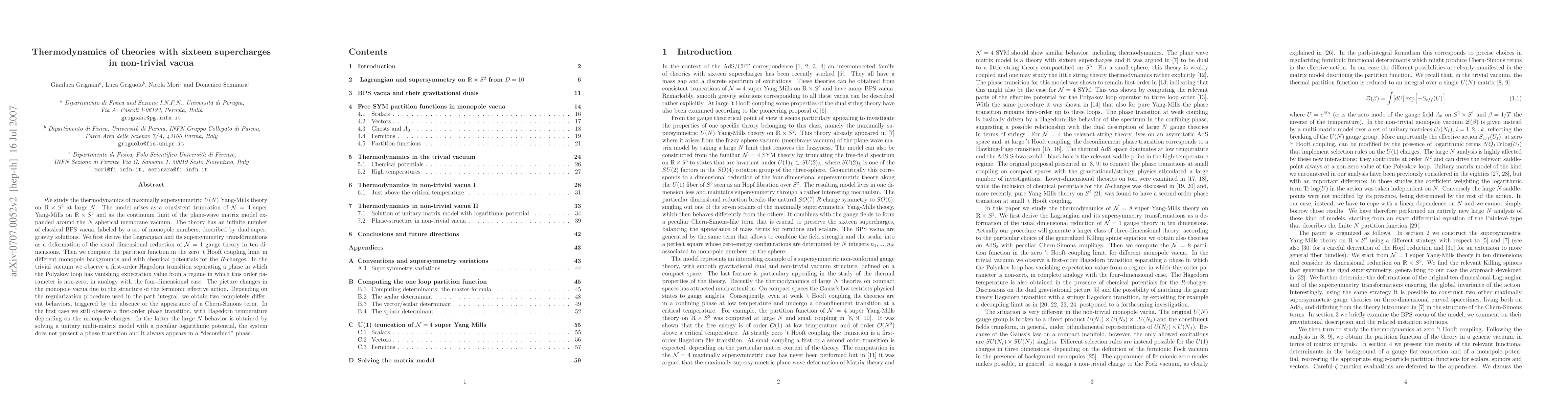We study the thermodynamics of maximally supersymmetric U(N) Yang-Mills theory on $\mathds{R}\times S^2$ at large $N$. The model arises as a consistent truncation of ${\cal N}=4$ super Yang-Mills on $\mathds{R}\times S^3$ and as the continuum limit of the plane-wave matrix model expanded around the $N$ spherical membrane vacuum. The theory has an infinite number of classical BPS vacua, labeled by a set of monopole numbers, described by dual supergravity solutions. We first derive the Lagrangian and its supersymmetry transformations as a deformation of the usual dimensional reduction of ${\cal N}=1$ gauge theory in ten dimensions. Then we compute the partition function in the zero 't Hooft coupling limit in different monopole backgrounds and with chemical potentials for the $R$-charges. In the trivial vacuum we observe a first-order Hagedorn transition separating a phase in which the Polyakov loop has vanishing expectation value from a regime in which this order parameter is non-zero, in analogy with the four-dimensional case. The picture changes in the monopole vacua due to the structure of the fermionic effective action. Depending on the regularization procedure used in the path integral, we obtain two completely different behaviors, triggered by the absence or the appearance of a Chern-Simons term. In the first case we still observe a first-order phase transition, with Hagedorn temperature depending on the monopole charges. In the latter the large $N$ behavior is obtained by solving a unitary multi-matrix model with a peculiar logarithmic potential, the system does not present a phase transition and it always appears in a ``deconfined'' phase.