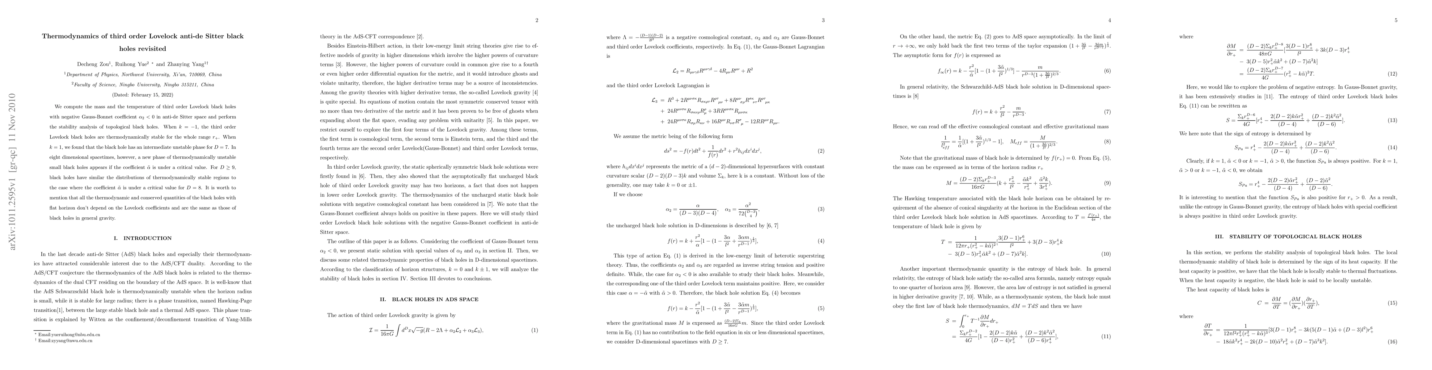 This paper investigates the thermodynamics of third order Lovelock anti-de Sitter black holes, finding stability conditions dependent on the Gauss-Bonnet coefficient and spacetime dimension. It reveals thermodynamic stability for $k=-1$ and identifies new unstable phases in higher dimensions.
