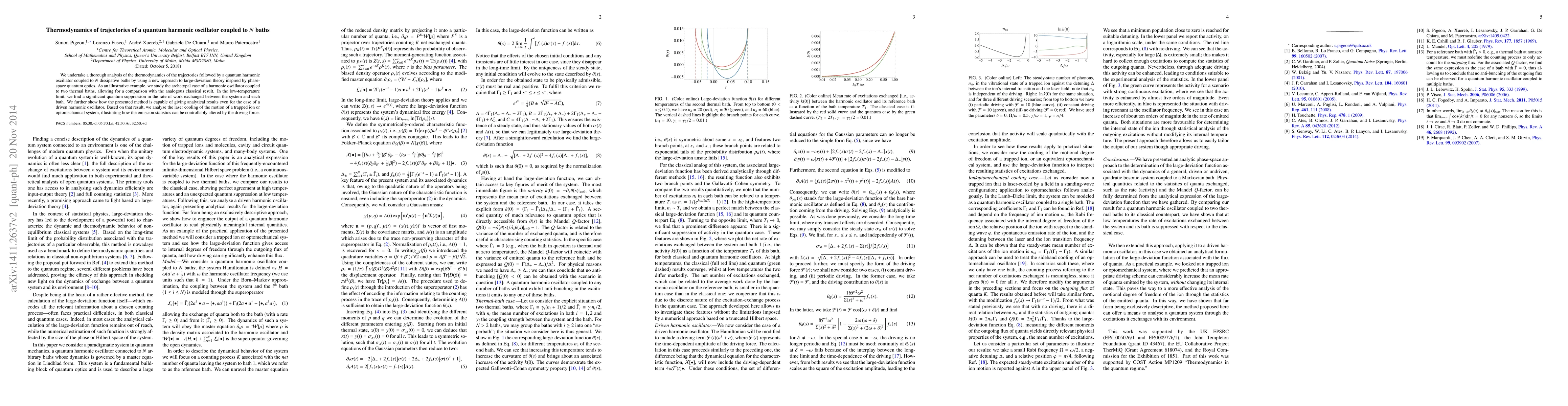 This paper analyzes the thermodynamics of a quantum harmonic oscillator coupled to multiple dissipative baths using a novel large-deviation theory approach. It finds significant quantum suppression in work exchange rates in low-temperature conditions and demonstrates the method's analytical capabilities for driven systems, applying it to laser cooling of trapped ions.