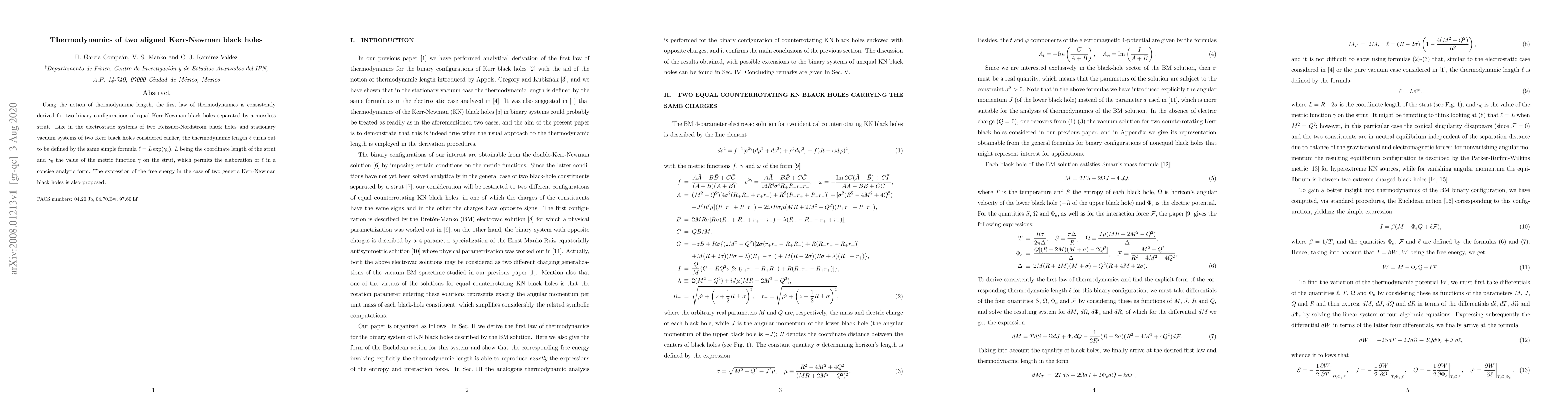 This paper derives the first law of thermodynamics for two aligned Kerr-Newman black holes separated by a massless strut, introducing a thermodynamic length formula $\ell=L\exp(\gamma_0)$ similar to previous studies on Reissner-Nordström and Kerr black holes. It also proposes an expression for the free energy of two generic Kerr-Newman black holes.
