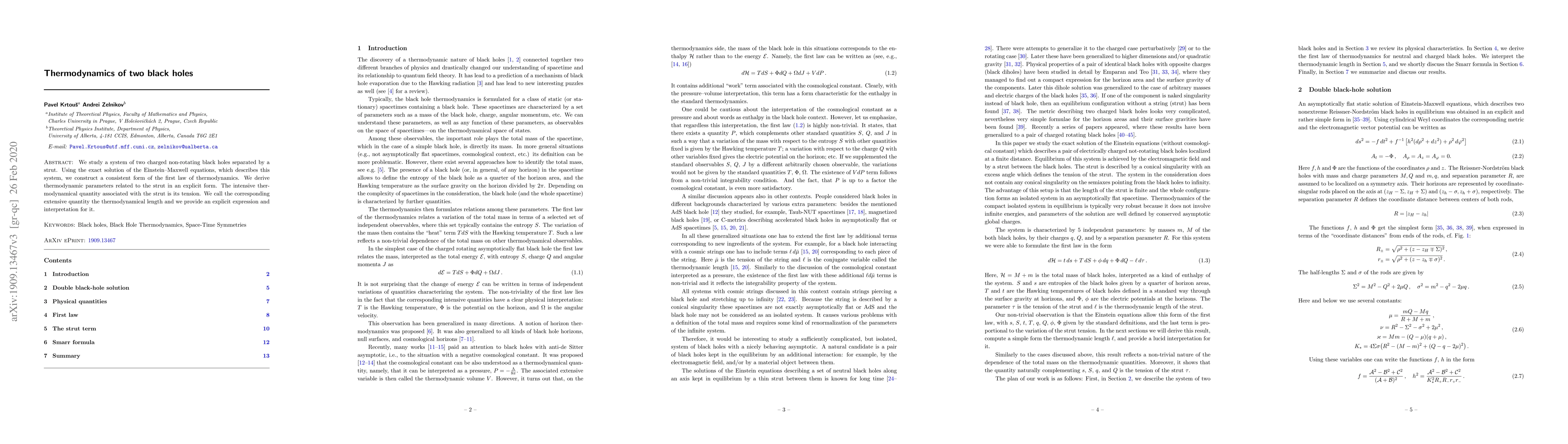 We study a system of two charged non-rotating black holes separated by a strut. Using the exact solution of the Einstein-Maxwell equations, which describes this system, we construct a consistent form of the first law of thermodynamics. We derive thermodynamic parameters related to the strut in an explicit form. The intensive thermodynamical quantity associated with the strut is its tension. We call the corresponding extensive quantity the thermodynamical length and we provide an explicit expression and interpretation for it.
