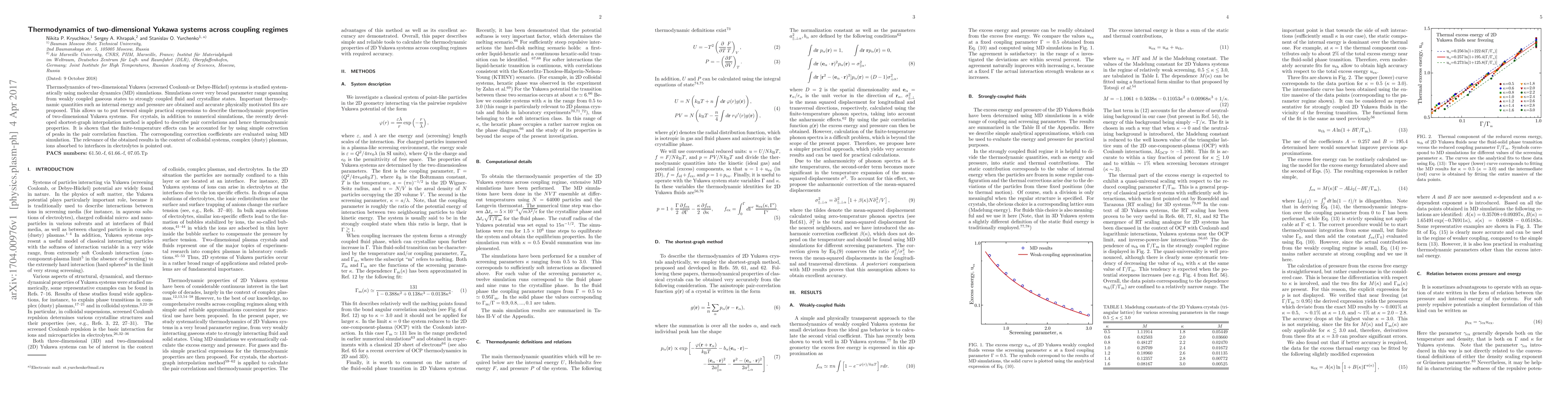This paper systematically investigates the thermodynamics of two-dimensional Yukawa systems across various coupling regimes using molecular dynamics simulations. The study provides simple expressions for thermodynamic properties and applies the shortest-graph interpolation method for crystalline states, highlighting the relevance to colloidal systems and plasmas.