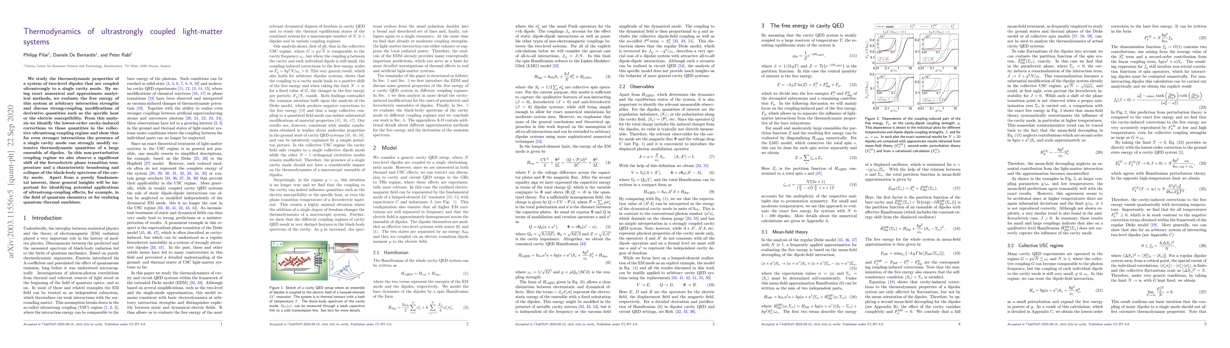 This paper investigates the thermodynamic properties of ultrastrongly coupled light-matter systems, revealing significant modifications in specific heat, electric susceptibility, and phase transition temperatures due to cavity-induced effects. The study highlights potential applications in quantum chemistry and quantum thermal machines.