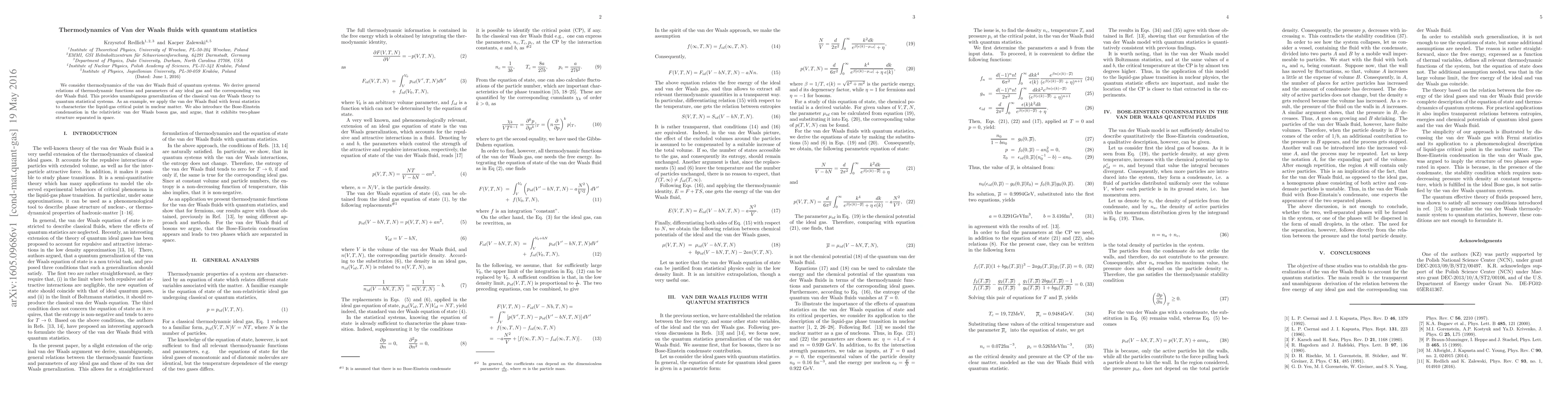 This paper derives thermodynamic relations for van der Waals fluids within quantum statistics, generalizing classical theory to quantum systems. It specifically applies Fermi statistics to describe nuclear matter's liquid-gas critical point and discusses Bose-Einstein condensation in a relativistic van der Waals boson gas, highlighting its two-phase spatial separation.