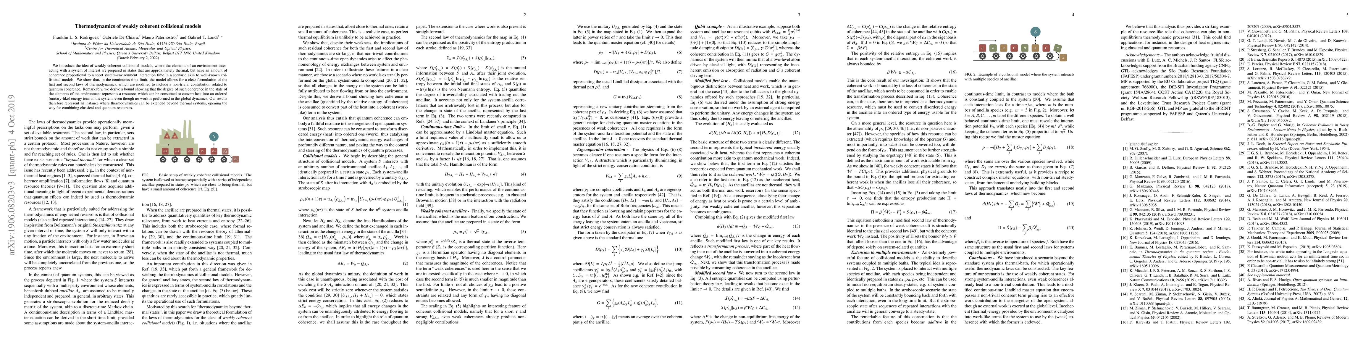 This paper introduces weakly coherent collisional models, demonstrating how quantum coherence can influence thermodynamic laws. It shows that coherence can convert heat into ordered energy without external work, extending thermodynamics beyond purely thermal systems.