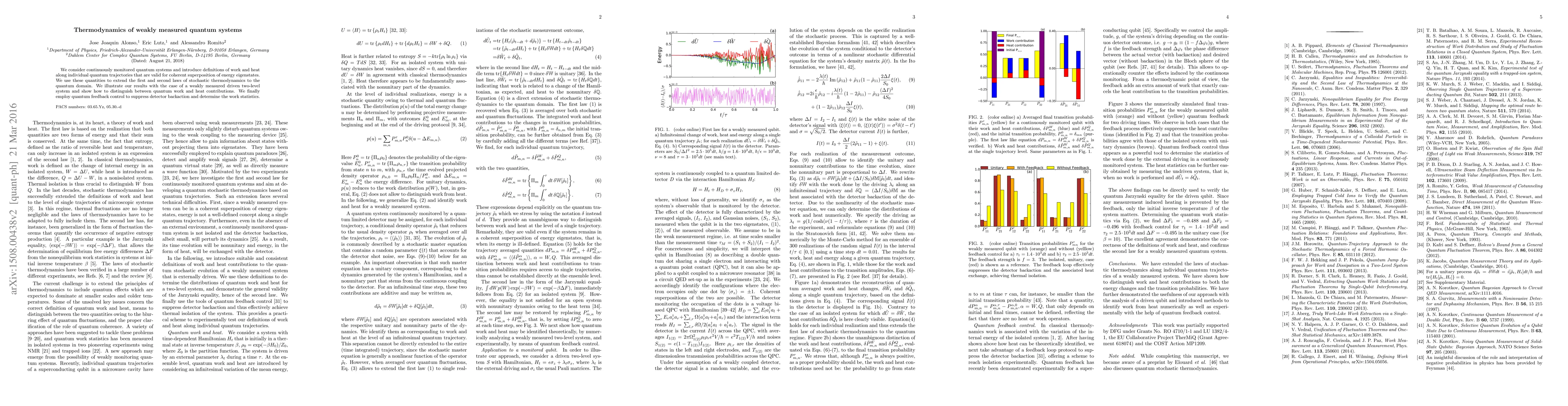This paper extends the first and second laws of stochastic thermodynamics to quantum systems, defining work and heat along individual quantum trajectories. It applies these concepts to a weakly measured driven two-level system, demonstrating how to distinguish between quantum work and heat contributions, and uses quantum feedback control to minimize detector backaction and analyze work statistics.