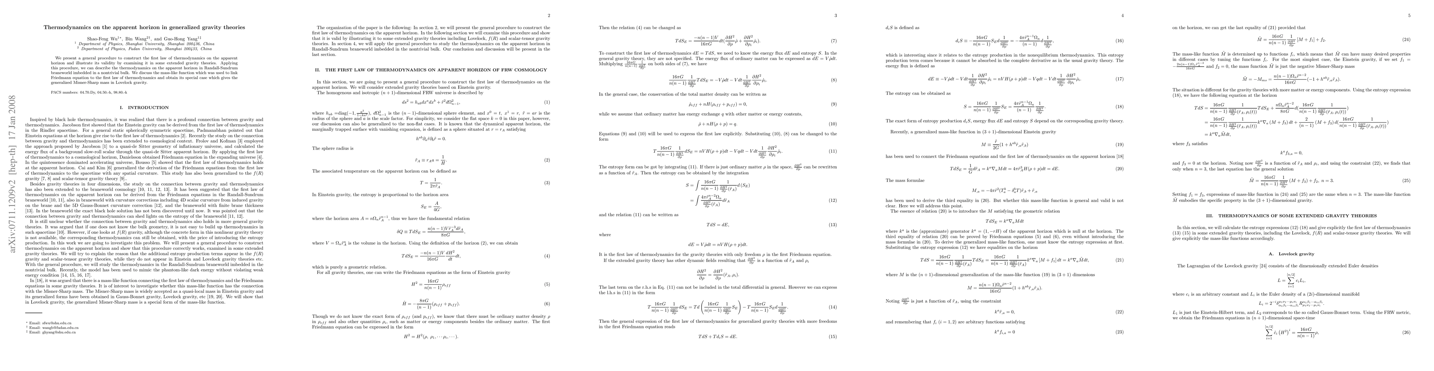 We present a general procedure to construct the first law of thermodynamics on the apparent horizon and illustrate its validity by examining it in some extended gravity theories. Applying this procedure, we can describe the thermodynamics on the apparent horizon in Randall-Sundrum braneworld imbedded in a nontrivial bulk. We discuss the mass-like function which was used to link Friedmann equation to the first law of thermodynamics and obtain its special case which gives the generalized Misner-Sharp mass in Lovelock gravity.