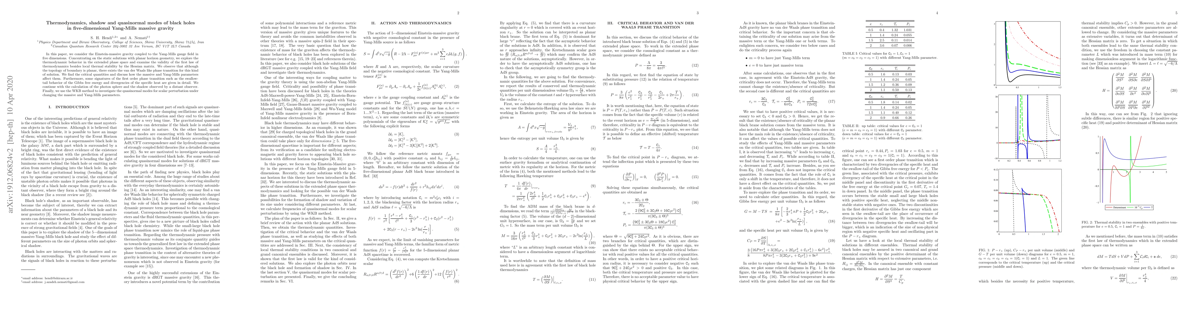 In this paper, we consider the Einstein-massive gravity coupled to the Yang-Mills gauge field in five dimensions. Concentrating on the static solutions with planar horizon geometry, we explore the thermodynamic behavior in the extended phase space and examine the validity of the first law of thermodynamics besides local thermal stability by the Hessian matrix. We observe that although the topology of boundary is planar, there exists the van der Waals like phase transition for this kind of solution. We find the critical quantities and discuss how the massive and Yang-Mills parameters affect them. Furthermore, some signatures of the first order phase transition such as the swallow-tail behavior of the Gibbs free energy and divergences of the specific heat are given in detail. We continue with the calculation of the photon sphere and the shadow observed by a distant observer. Finally, we use the WKB method to investigate the quasinormal modes for scalar perturbation under changing the massive and Yang-Mills parameters.