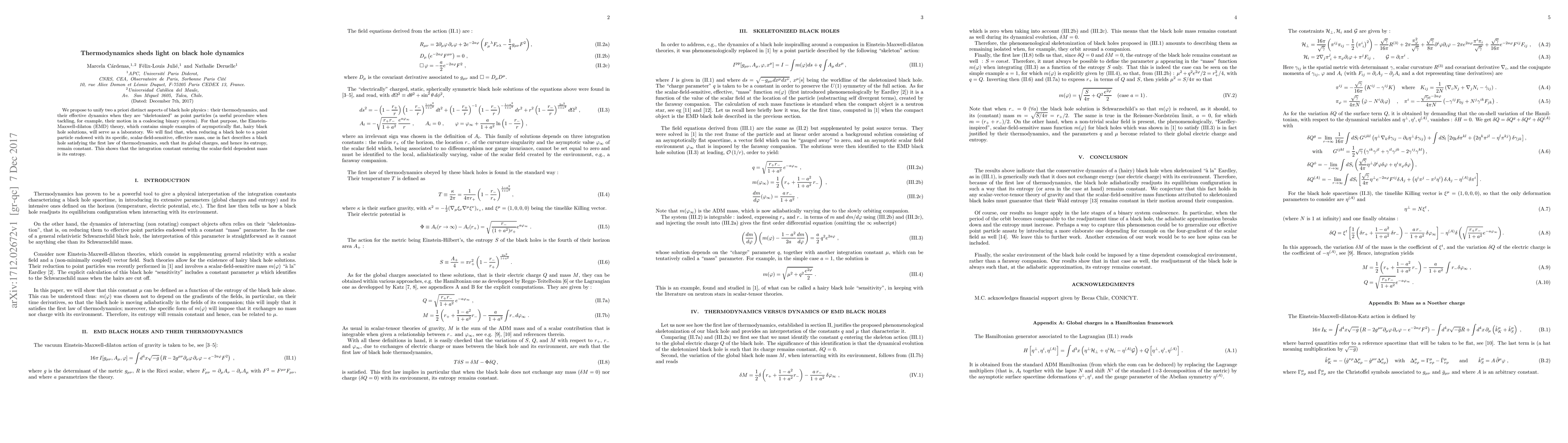 We propose to unify two a priori distinct aspects of black hole physics : their thermodynamics, and their effective dynamics when they are "skeletonized" as point particles (a useful procedure when tackling, for example, their motion in a coalescing binary system). For that purpose, the Einstein- Maxwell-dilaton (EMD) theory, which contains simple examples of asympotically flat, hairy black hole solutions, will serve as a laboratory. We will find that, when reducing a black hole to a point particle endowed with its specific, scalar-field-sensitive, effective mass, one in fact describes a black hole satisfying the first law of thermodynamics, such that its global charges, and hence its entropy, remain constant. This shows that the integration constant entering the scalar-field dependent mass is its entropy.