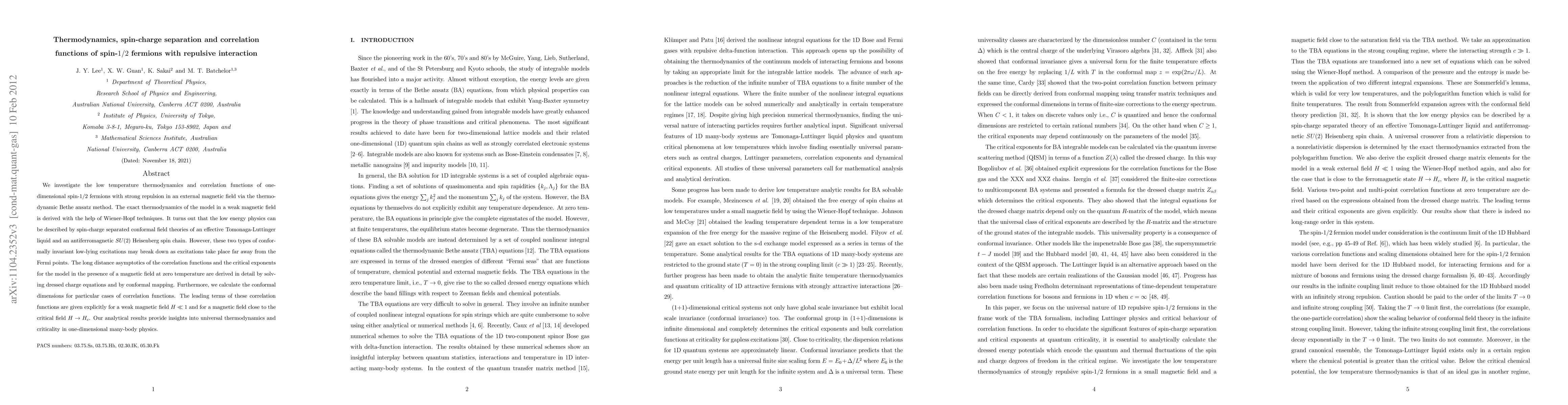 This paper explores the thermodynamics and correlation functions of one-dimensional spin-1/2 fermions with strong repulsive interactions using the thermodynamic Bethe ansatz and Wiener-Hopf techniques. The study reveals spin-charge separation in conformal field theories, with detailed derivations of long-distance asymptotics and critical exponents, providing insights into universal thermodynamics and criticality in one-dimensional many-body systems.
