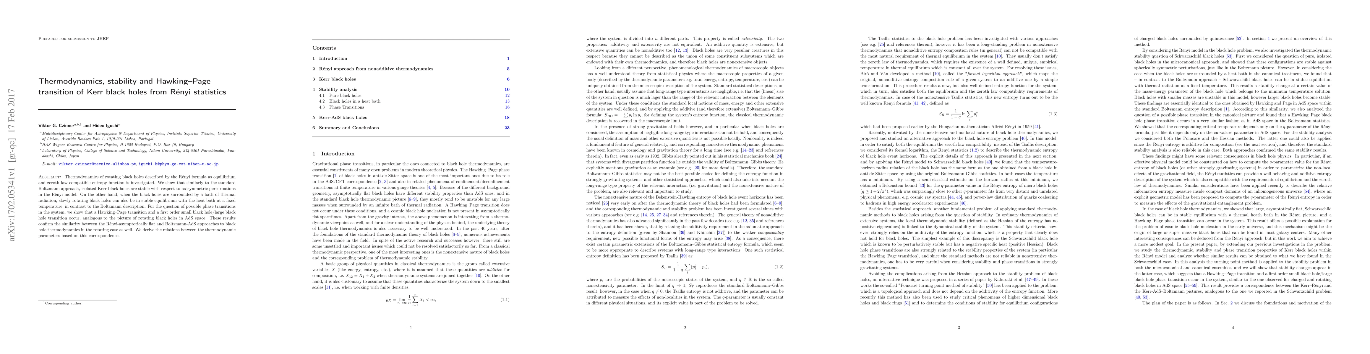This paper explores the thermodynamics of Kerr black holes using R\'enyi entropy, demonstrating their stability against perturbations and identifying a Hawking-Page transition. It finds that rotating black holes can achieve stable equilibrium with thermal radiation, contrasting with the standard Boltzmann approach, and confirms a first-order phase transition between small and large black holes.