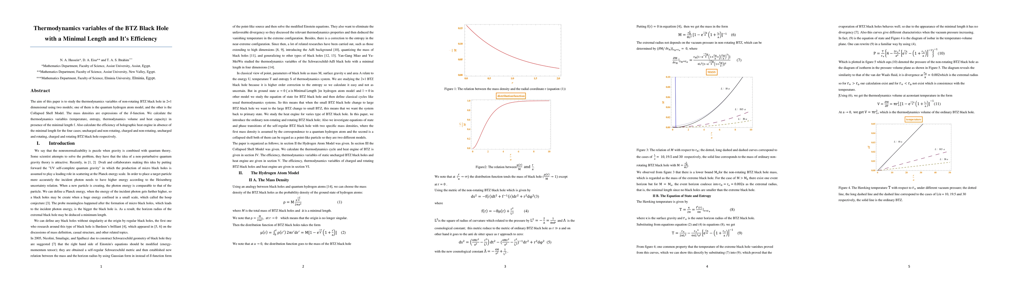 The aim of this paper is to study the thermodynamics variables of non-rotating BTZ black hole in 2+1 dimensional using two models; one of them is the quantum hydrogen atom model, and the other is the Collapsed Shell Model. We calculate the thermodynamics variables (temperature, entropy, thermodynamics volume and heat capacity) in presence of the minimal length f. Also calculate the efficiency of holographic heat engine in absence of the minimal length for the four cases; uncharged and non-rotating, charged and non-rotating, uncharged and rotating, charged and rotating BTZ black hole respectively.
