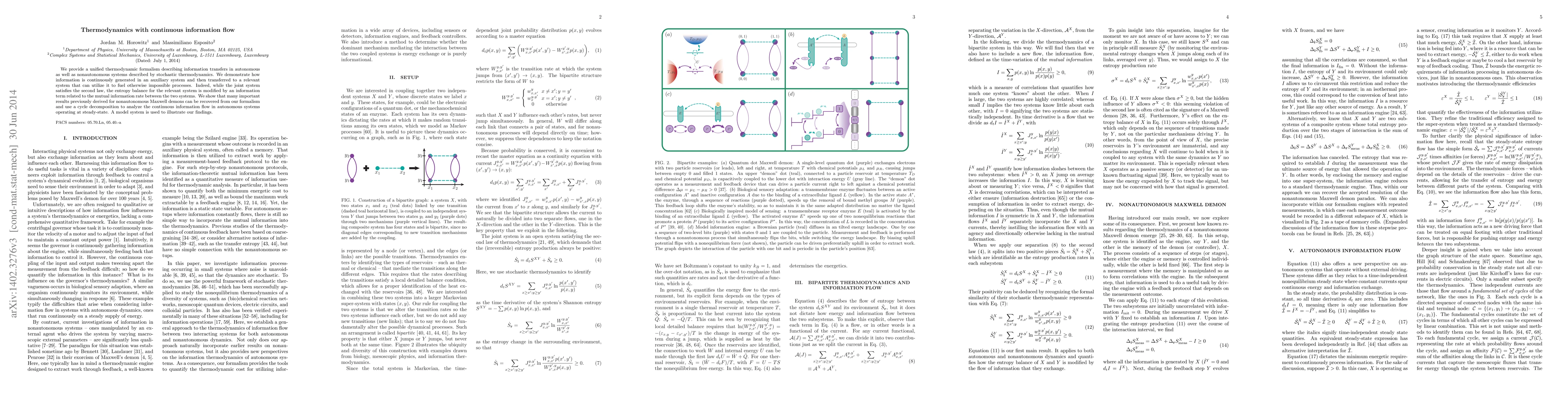 This paper presents a thermodynamic framework for continuous information flow in stochastic thermodynamics, showing how information generated in an auxiliary system can be transferred to fuel processes in a relevant system, modifying its entropy balance. The formalism recovers results from nonautonomous Maxwell demons and analyzes information flow in autonomous systems via cycle decomposition.