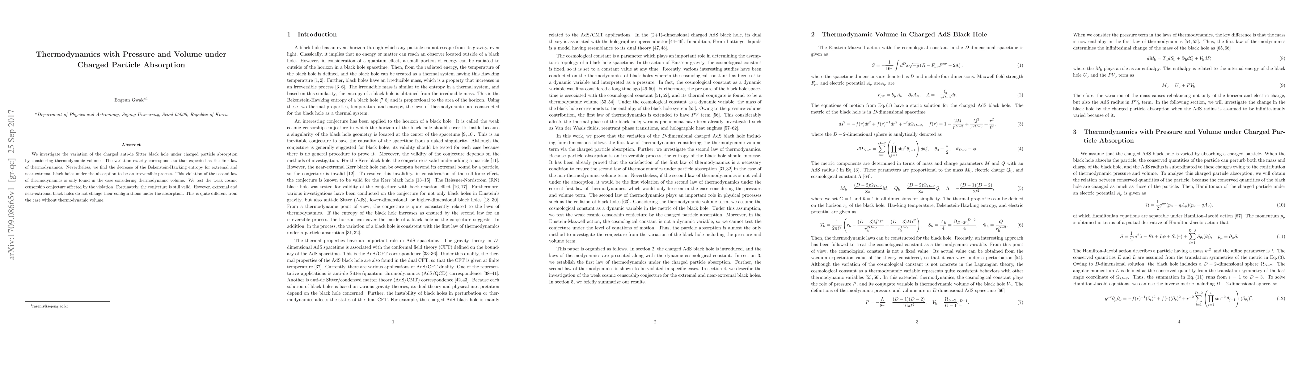 We investigate the variation of the charged anti-de Sitter black hole under charged particle absorption by considering thermodynamic volume. The variation exactly corresponds to that expected as the first law of thermodynamics. Nevertheless, we find the decrease of the Bekenstein-Hawking entropy for extremal and near-extremal black holes under the absorption to be an irreversible process. This violation of the second law of thermodynamics is only found in the case considering thermodynamic volume. We test the weak cosmic censorship conjecture affected by the violation. Fortunately, the conjecture is still valid. However, extremal and near-extremal black holes do not change their configurations under the absorption. This is quite different from the case without thermodynamic volume.