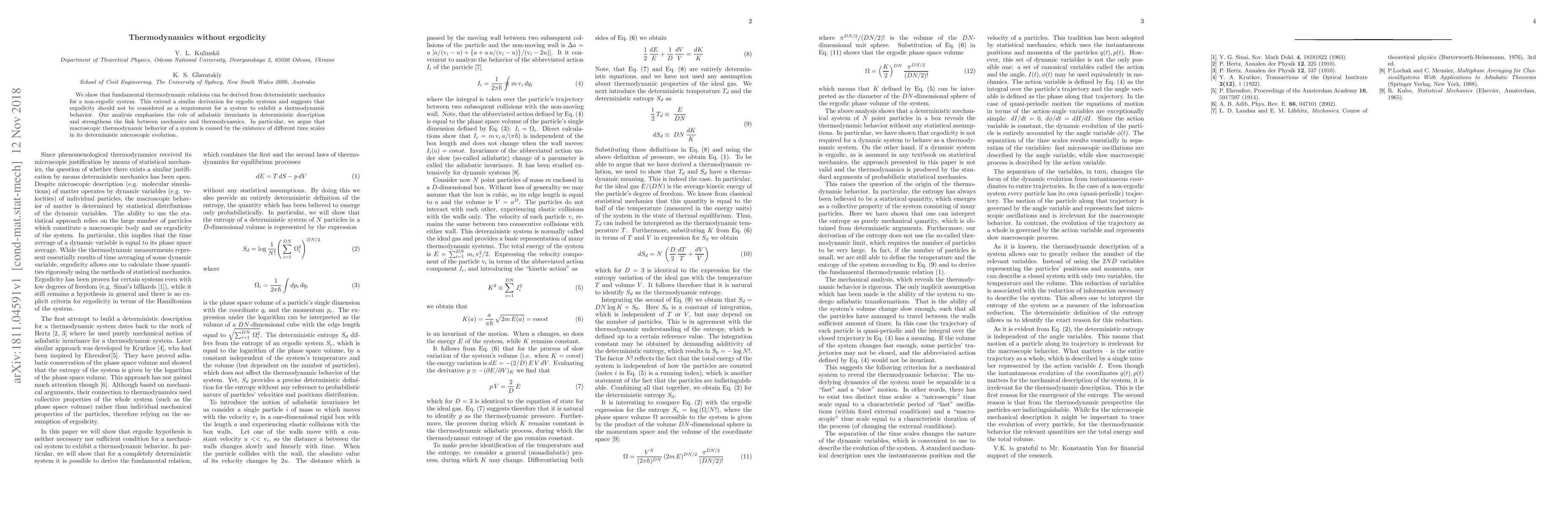 We show that fundamental thermodynamic relations can be derived from deterministic mechanics for a non-ergodic system. This extend a similar derivation for ergodic systems and suggests that ergodicity should not be considered as a requirement for a system to exhibit a thermodynamic behavior. Our analysis emphasizes the role of adiabatic invariants in deterministic description and strengthens the link between mechanics and thermodynamics. In particular, we argue that macroscopic thermodynamic behavior of a system is caused by the existence of different time scales in its deterministic microscopic evolution.