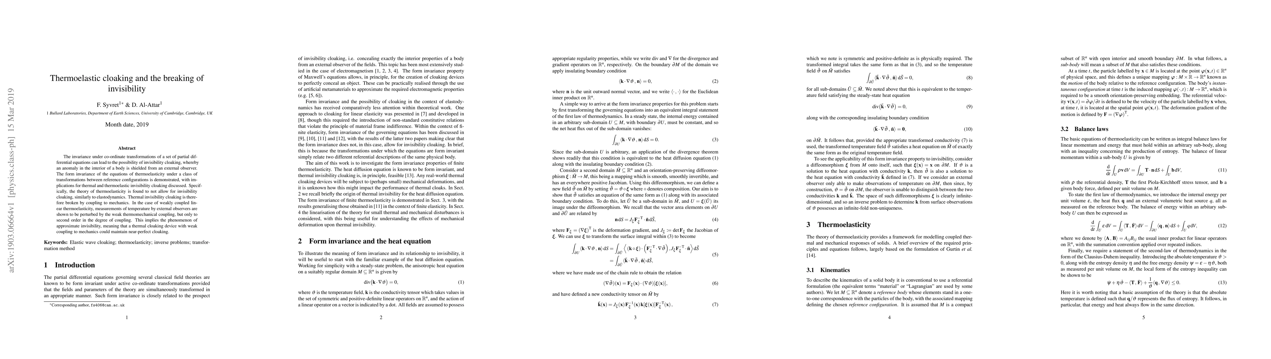 Summary: The paper explores the invariance of thermoelasticity equations under transformations, demonstrating the impossibility of invisibility cloaking in this context. While weak thermomechanical coupling allows for approximate invisibility, it ultimately breaks true thermal invisibility cloaking due to the coupling effects.
