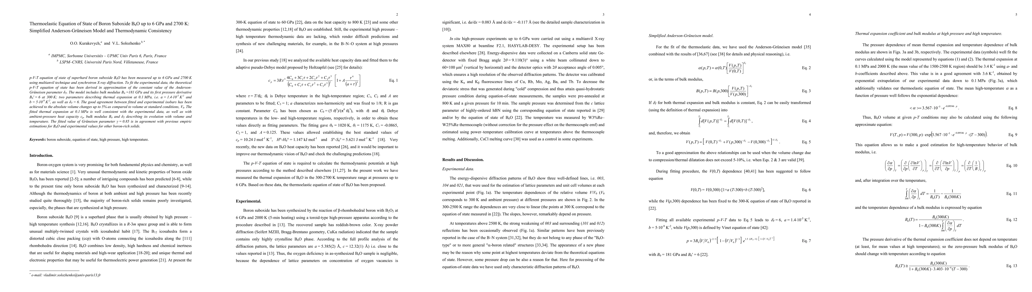 This paper measures the p-V-T equation of state for boron suboxide B6O up to 6 GPa and 2700 K using multianvil and synchrotron X-ray techniques. A simplified Anderson-Gr\"uneisen model fits the data well, yielding consistent thermodynamic parameters including bulk modulus and thermal expansion.