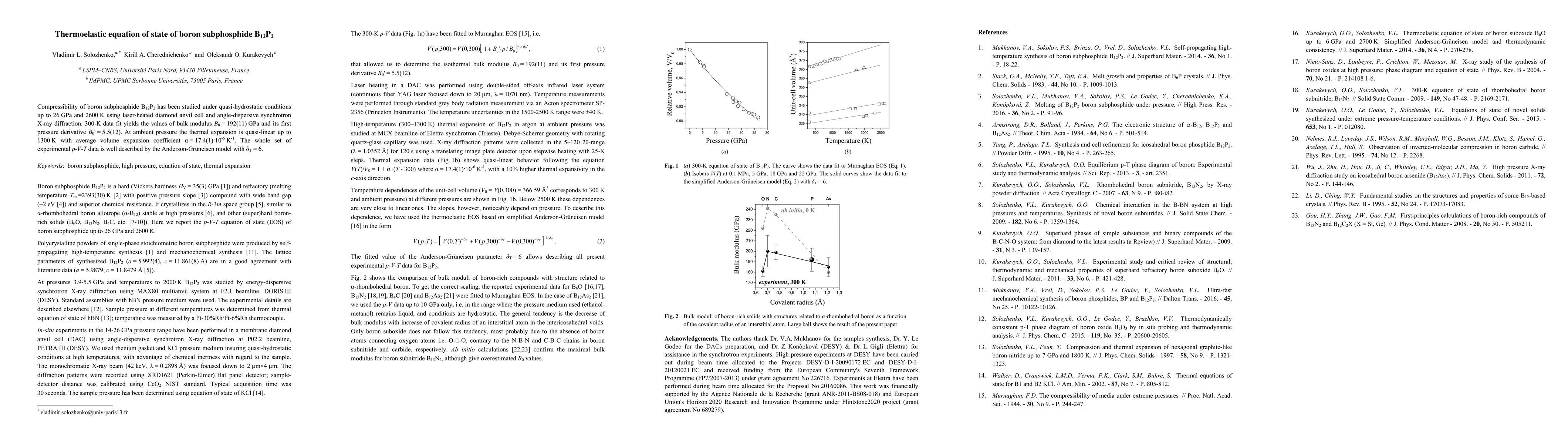 The research investigates boron subphosphide B12P2's thermoelastic properties under high pressure and temperature using laser-heated diamond anvil cell and X-ray diffraction. Key findings include a bulk modulus of 192(11) GPa and first pressure derivative of 5.5(12) at 300K, quasi-linear thermal expansion up to 1300K with an average expansion coefficient of 17.4(1) 10-6 K-1, and successful description of p-V-T data by the Anderson-Grüneisen model.